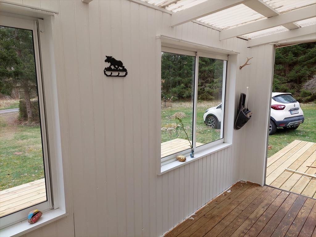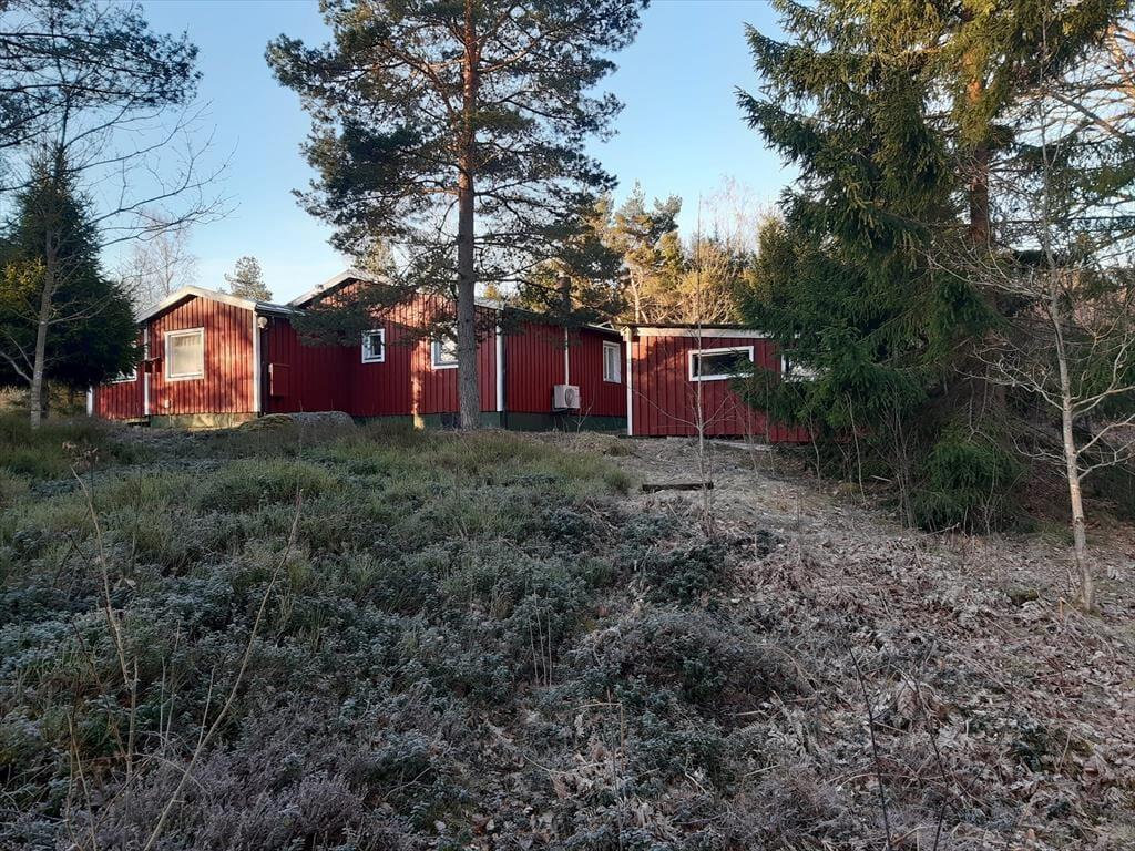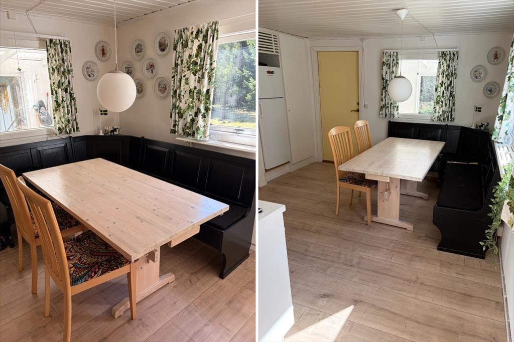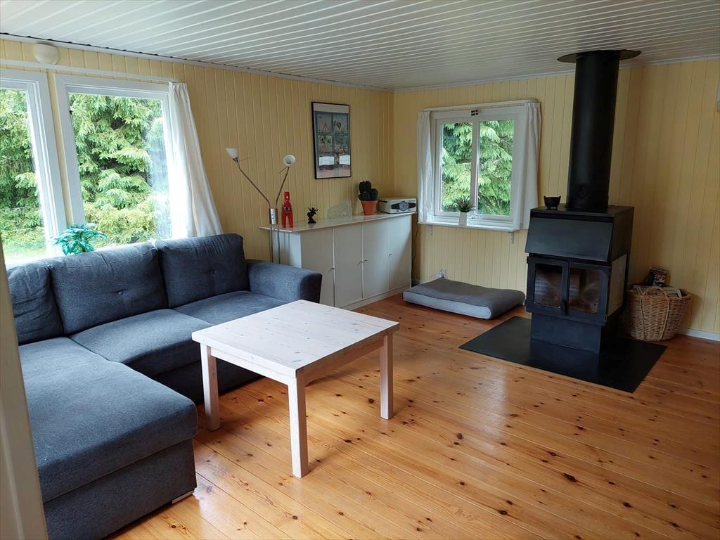 Auf 56 m² bietet das Haus bis zu 6 Erwachsenen und 2 Haustieren genügend Platz. Du betrittst es über die Holzterrasse kommend durch den 14 m² großen Wintergarten mit Glasschiebetüren. Von dort aus gelangst du durch die Haupteingangstür direkt in die Küche, die neben einem Kühlschrank mit Gefrierfach, Ofen, Herd, Mikrowelle und Wasserkocher alles beinhaltet, was du zum Zubereiten und Servieren gängiger Gerichte für sechs Personen benötigst. Die Küche liegt in halboffener Verbindung zum Wohnzimmer, in dem du dich auf dem großen Ecksofa vor dem prasselnden Kaminofen entspannen kannst. Der Fernseher empfängt nur schwedische Kanäle, verfügt aber aber über einen DVD-Player. Die sechs Schlafplätze verteilen sich auf ein Schlafzimmer mit Doppelbett, ein zweites mit selbstgebautem Etagenbett mit breiten Matratzen und auf ein doppeltes Schlafsofa im Wohnzimmer. Die Betten sind von 2020. Das Badezimmer ist mit WC und Dusche ausgestattet. Eine Waschmaschine gibt es leider nicht, aber wenn du etwas mit der Hand waschen möchtest, steht dir ein Wäscheständer zur Verfügung. An der Feuerstelle mit Grillrost im Garten kannst du romantische Abende mit Stockbrot oder Grillgut verbringen. Wenn du lieber überdacht, aber dennoch an der frischen Luft sitzen möchtest, kannst du dich in den Wintergarten zurückziehen. Ein Schrank voll mit Spielen, Büchern, Stiften, Malbüchern usw. sowie das großzügig bemessene Grundstück und der nur spärliche Verkehr auf dem vorbeiführenden Schotterweg machen das Haus besonders kinderfreundlich. Für optimale Raumtemperaturen sorgen die moderne Wärmepumpe, ein paar E-Heizkörper und ein Kaminofen. Das Grundstück ist außerdem auch hundefreundlich: Es gibt Erdspieße mit langer Leine, zwei Hundekörbe sowie Futter- und Wassernäpfe. Der Garten ist zwar nicht eingezäunt, aber größtenteils von einer Hecke umgeben.