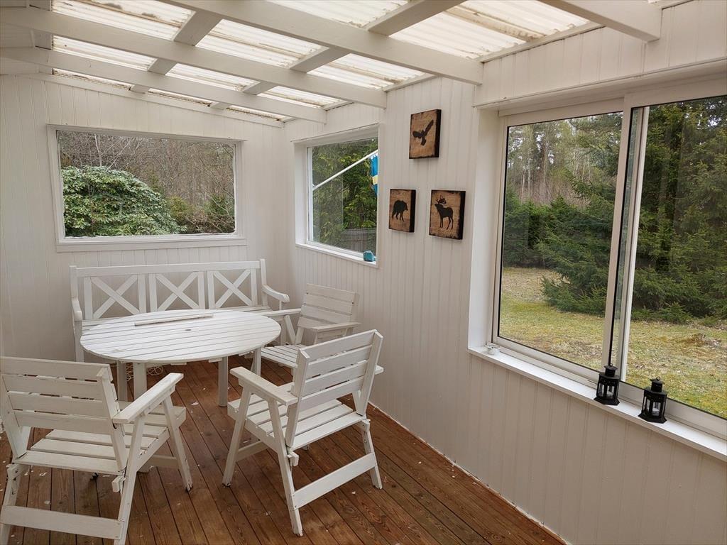 Auf 56 m² bietet das Haus bis zu 6 Erwachsenen und 2 Haustieren genügend Platz. Sie betreten es über die Holzterrasse kommend durch den Wintergarten. Von dort aus gelangen Sie durch die Haupteingangstür direkt in die Küche, die neben einem Kühlschrank mit Gefrierfach, Ofen, Herd, Mikrowelle und Wasserkocher alles beinhaltet, was Sie zum Zubereiten und Servieren gängiger Gerichte für sechs Personen benötigen. Die Küche liegt in halboffener Verbindung zum Wohnzimmer, in dem Sie sich auf dem großen Ecksofa vor dem prasselnden Kaminofen entspannen können. Der Fernseher empfängt nur schwedische Kanäle, verfügt aber aber über einen DVD-Player. Die sechs Schlafplätze verteilen sich auf ein Schlafzimmer mit Doppelbett, ein zweites mit selbstgebautem Etagenbett mit breiten Matratzen und auf ein doppeltes Schlafsofa im Wohnzimmer. Die Betten sind von 2020. Das Badezimmer ist mit WC und Dusche ausgestattet. Eine Waschmaschine und ein Wäschetrockner ermöglichen auch längere Aufenthalte.