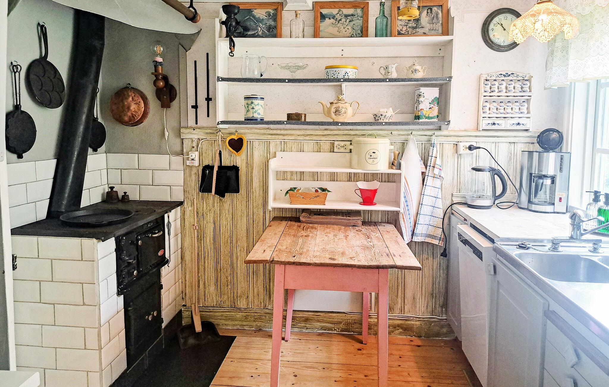 Ihr gemütliches Ferienhaus bietet Ihnen eine stimmungsvolle Kulisse für eine erholsame Auszeit in ruhiger, naturnaher Lage. Lassen Sie sich vom traditionellen Stil des liebevoll gestalteten Hauses empfangen und genießen Sie die familiäre Atmosphäre. Entspannen Sie im wohnlich eingerichteten Esszimmer mit klassischen Möbeln, Schaukelstuhl und Holzofen. Die sanften Farbtöne, Holzfußböden und floralen Tapeten schaffen ein harmonisches Ambiente. Kochen Sie in der Küche mit modernem Komfort und nostalgischem Herd. Genießen Sie Ihre Mahlzeiten am rustikalen Esstisch mit Blick ins Grüne. Die obere Etage eignet sich wunderbar zum Zurückziehen und Träumen.
