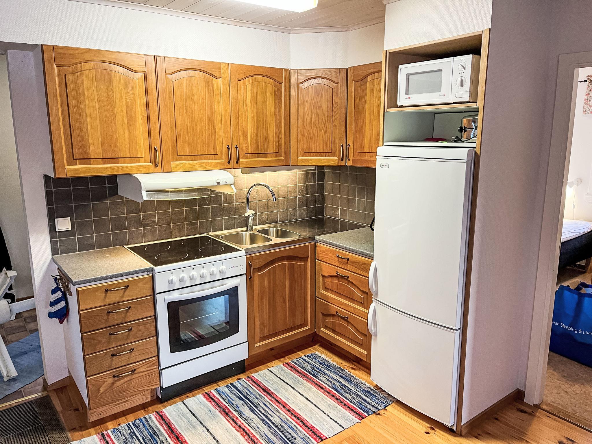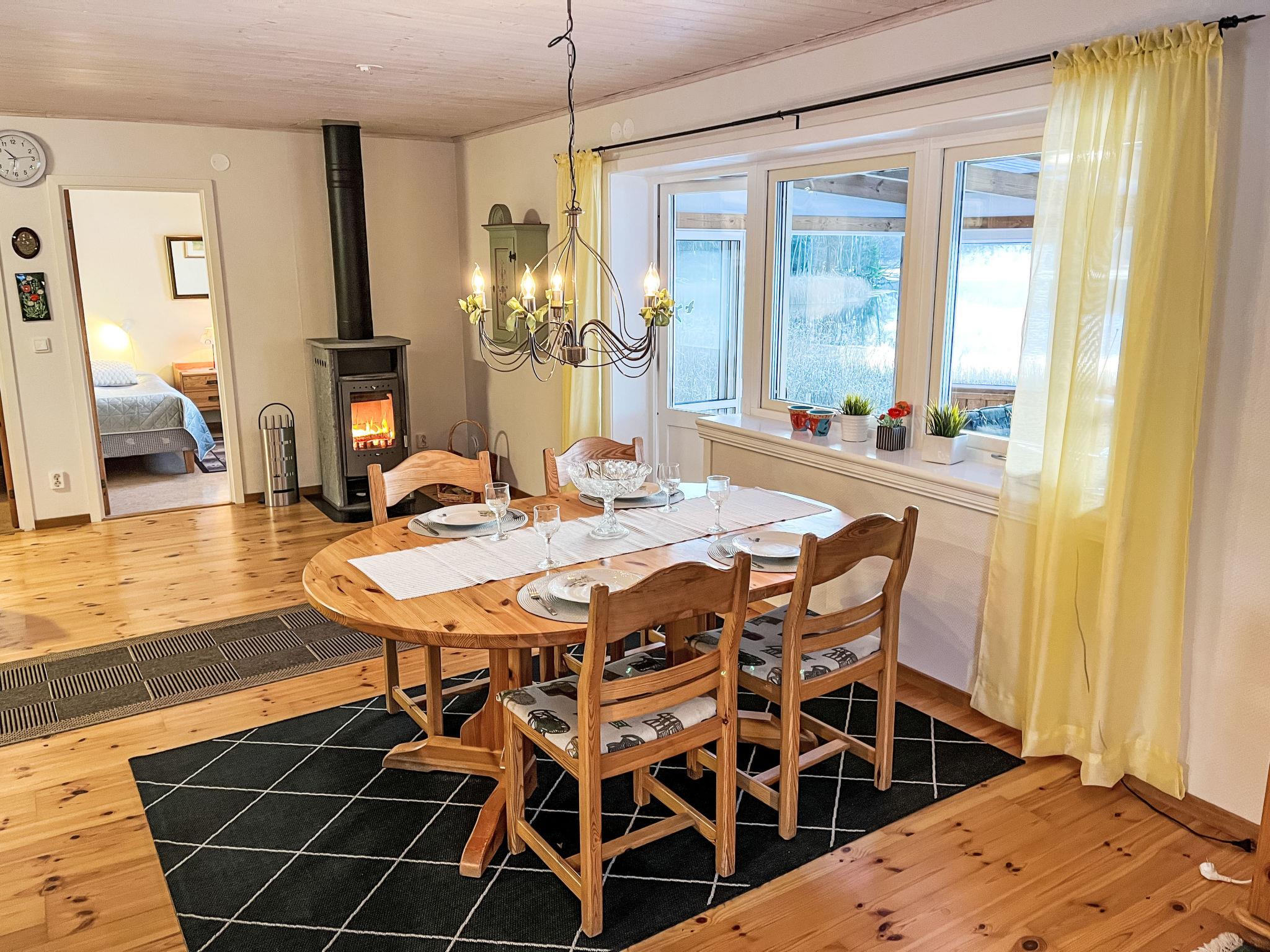 "Hults-Kulla", 3-room house. Comfortable furnishings: living room with Scandinavian wood stove, TV and international TV channels. 2 rooms, each room with 2 beds (90 cm, length 200 cm). Open kitchen (oven, 4 ceramic glass hob hotplates, toaster, kettle, microwave, freezer, electric coffee machine) with dining table. Shower/WC, Sauna. Electric heating, wood heating, forced-air heating. Wooden floors, parquet floors. Terrace 15 m2. Terrace furniture, barbecue (portable). Beautiful panoramic view of the lake. Please note: non-smoking house.