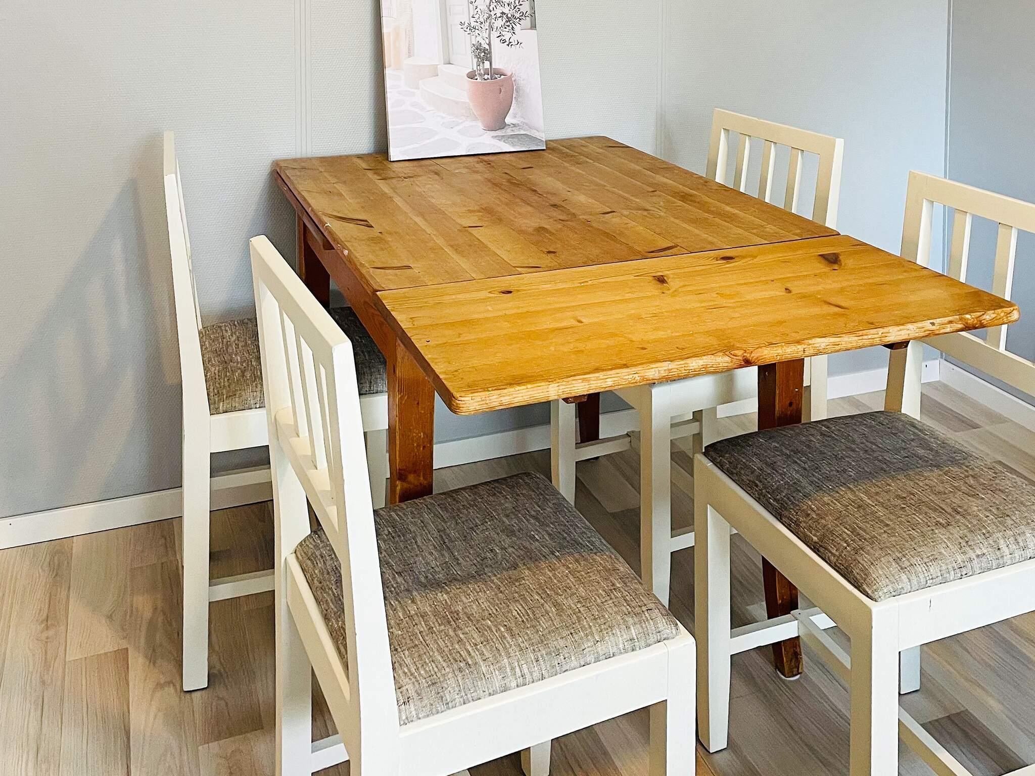 Im Eingangsbereich gibt es Platz für Schuhe und Oberbekleidung. Die kleine, aber funktionale Küche bietet Ihnen die Möglichkeit, nach den Erlebnissen des Tages ein schönes Abendessen zu kochen. Das Schlafzimmer verfügt über zwei Etagenbetten, von denen eines über ein breiteres unteres Regal verfügt, das einen gemütlichen Schlafplatz bietet. Badezimmer mit Toilette, Waschbecken und Dusche. Im Wohnzimmer gibt es einen Esstisch mit Stühlen und ein Sofa.
