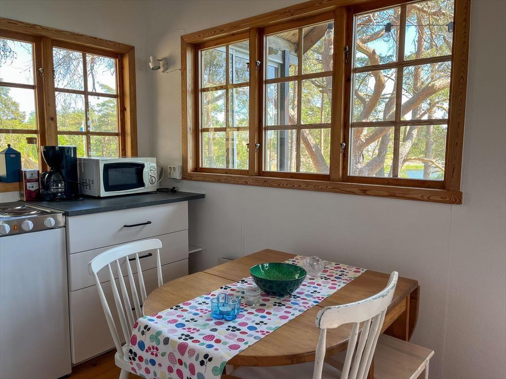 Das authentisch renovierte Ensemble besteht aus 4 Hütten mit einer Gesamtaufteilung von 5 Zimmern, Küche, Bad und 2 WC. Das Haupthaus umfasst etwa 60 m², das Gästehaus etwa 25 m², das Schlafhaus etwa 20 m² und das Badehaus etwa 10 m². Die Ferienhäuser stammen aus dem Jahr 1800. Im Haupthaus findest du eine Küche mit E-Herd, Backofen, Kühl- und Gefrierschrank, Geschirrspüler, Kaffeemaschine, Mikrowelle und Esstisch sowie einen großen Esstisch, eine Sitzgruppe, einen offenen Kamin, TV und einen DVD-Player. Der Schlafboden im Haupthaus bietet 2 Matratzen. Zusätzlich gibt es ein WC im Haupthaus. Das Gästehaus verfügt über eine weitere kleine Küche mit 2-Platten-Herd, Mikrowelle und Esstisch. Im Schlafzimmer des Gästehauses steht ein Doppelbett (1,60 m) und auf dem Schlafboden befinden sich 4 Matratzen. Das Schlafhaus bietet ein Schlafzimmer mit kleinem Doppelbett (1,20 m) und ein weiteres Schlafzimmer mit einem Etagenbett für Jugendliche. Im Badehaus findest du ein Bad mit WC, Dusche und Waschmaschine. Insgesamt stehen dir 6 Betten und weitere Matratzen zur Verfügung. Zur Außenausstattung gehören eine Veranda mit herrlichem Meeresblick, ein großer Badesteg mit Sitzmöglichkeit, ein eigenes Ruderboot für maximal 5 Personen mit kleinem Motor, 2 Kajaks, diverse Gartenmöbel, ein Grill und ein Trampolin. Die Parkmöglichkeit befindet sich am Festland nahe dem Bootsanleger.