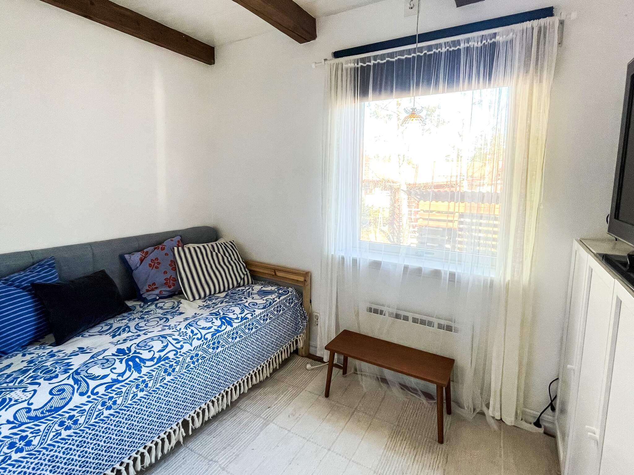 Das Ferienhaus bietet innen einen großen, offenen Wohnraum mit Wohn- und Essbereich, Küche und Herd. Das Dach ist bis zum First offen, was einen luftigen und schönen Raum schafft. Eine steile Treppe führt Sie hinauf zu einem gemütlichen Schlafboden mit einem bequemen Doppelbett. Es gibt drei weitere Schlafzimmer im Haus selbst, jeweils mit einem Einzelbett. Im separaten Annex steht ein Ausziehbett bereit, das zu einem Doppelbett umfunktioniert werden kann.