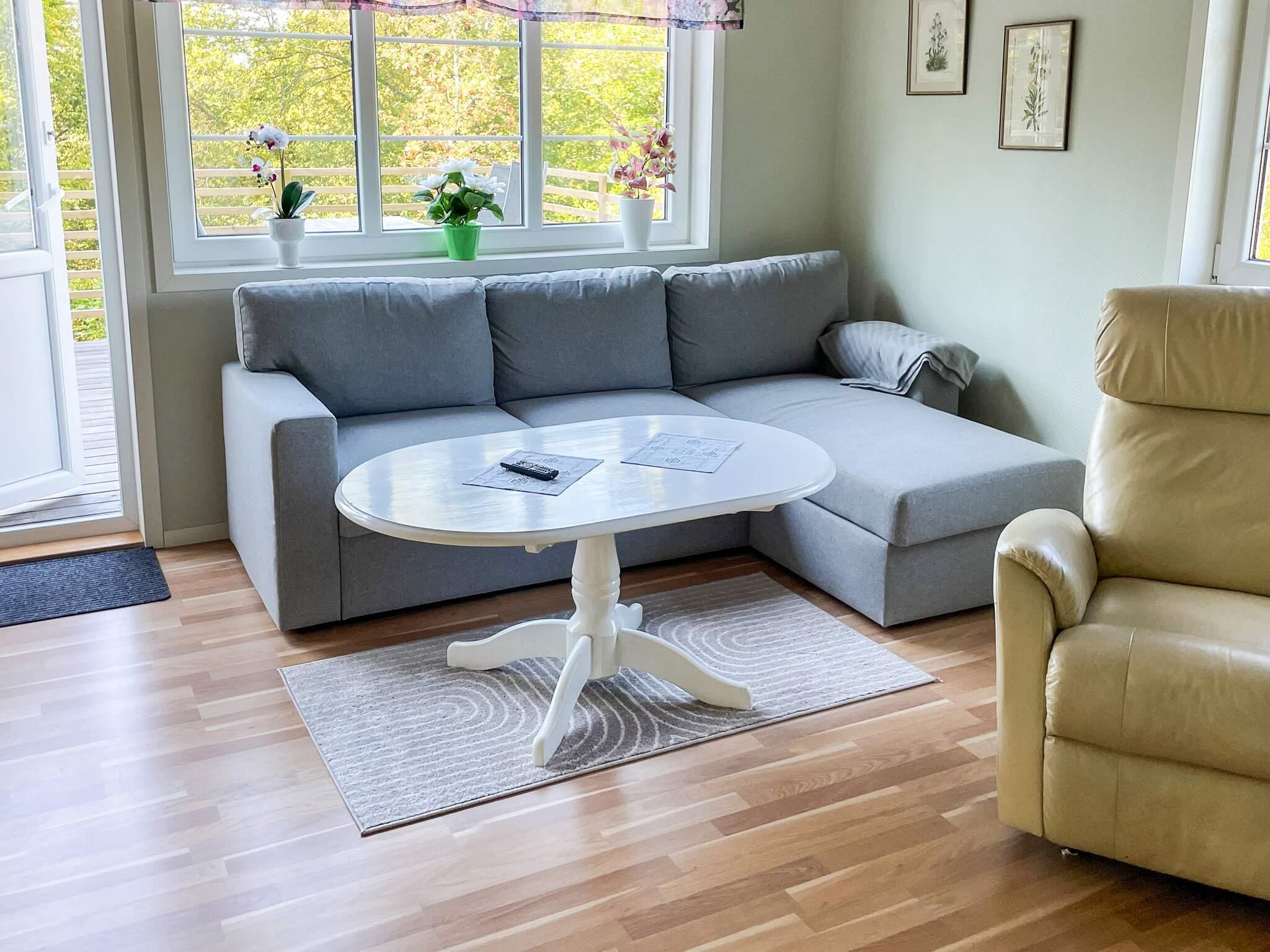 Das Ferienhaus hat eine große Terrasse mit Gartenmöbeln und Holzkohlegrill sowie Seeblick. Von hier aus führt eine Terrassentür in die Küche mit offenem Grundriss und hoher Decke bis zum First, was viel Raum bietet. In diesem großen Familienzimmer mit Kamin in der Mitte des Hauses gibt es einen Esstisch und eine doppelte Schlafcouch. Das Anzünden eines Feuers sorgt für wohlige Wärme sowie für einen erhöhten Gemütlichkeitsfaktor. Brennholz können Sie nach Ankunft über den Hauseigentümer beziehen. Das Ferienhaus verfügt über zwei schöne Schlafzimmer mit jeweils einem Doppelbett. Das Badezimmer, mit Eingang vom Flur aus, liegt neben den Schlafzimmern und ist hell und modern sowie mit einer Waschmaschine ausgestattet.