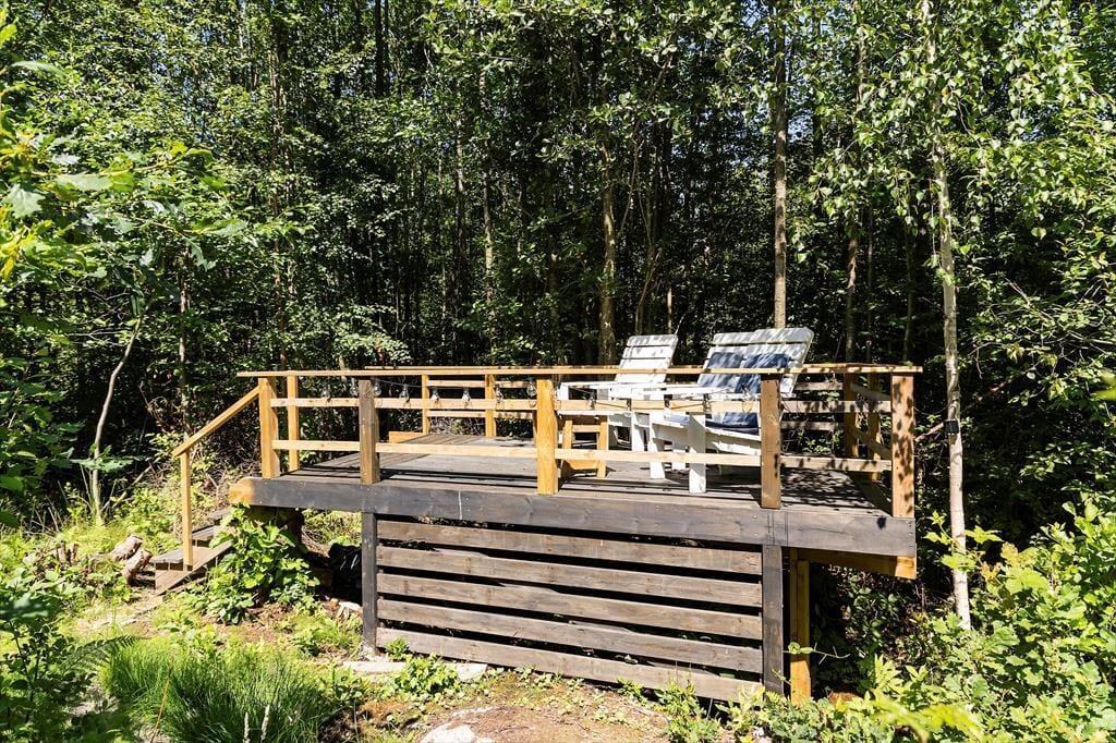 Sie betreten das Haus über die große Holzterrasse und stehen sofort im lichtdurchfluteten Koch- und Essbereich mit hohen Decken und großzügiger Verglasung. Die Küche bietet neben E-Herd, Ofen, Kühl- und Gefrierschrank, Mikrowelle, Wasserkocher und Kaffeemaschine alles, was Sie zum Zubereiten und Servieren gängiger Gerichte benötigen. Die Mahlzeiten können Sie entweder am Esstisch oder auf der Holzterrasse mit Gartenmöbeln und Grill einnehmen. Zum Entspannen, Lesen oder Fernsehen können Sie sich auf den über eine Treppe erreichbaren Wohnbereich mit Stehhöhe zurückziehen, der mit einem Sofa und zwei Sesseln eingerichtet ist. Links neben der Küchenzeile befindet sich das Badezimmer mit WC und Dusche. Geschlafen wird im über eine Schiebetür vom Koch- und Essbereich getrennten Schlafzimmer mit Doppelbett und Etagenbett im Souterrain. Bei Bedarf kann ein zusätzliches Bett für 2 Personen auf dem Dachboden aufgestellt werden. Ein Kinderbett für Kleinkinder steht ebenfalls zur Verfügung.