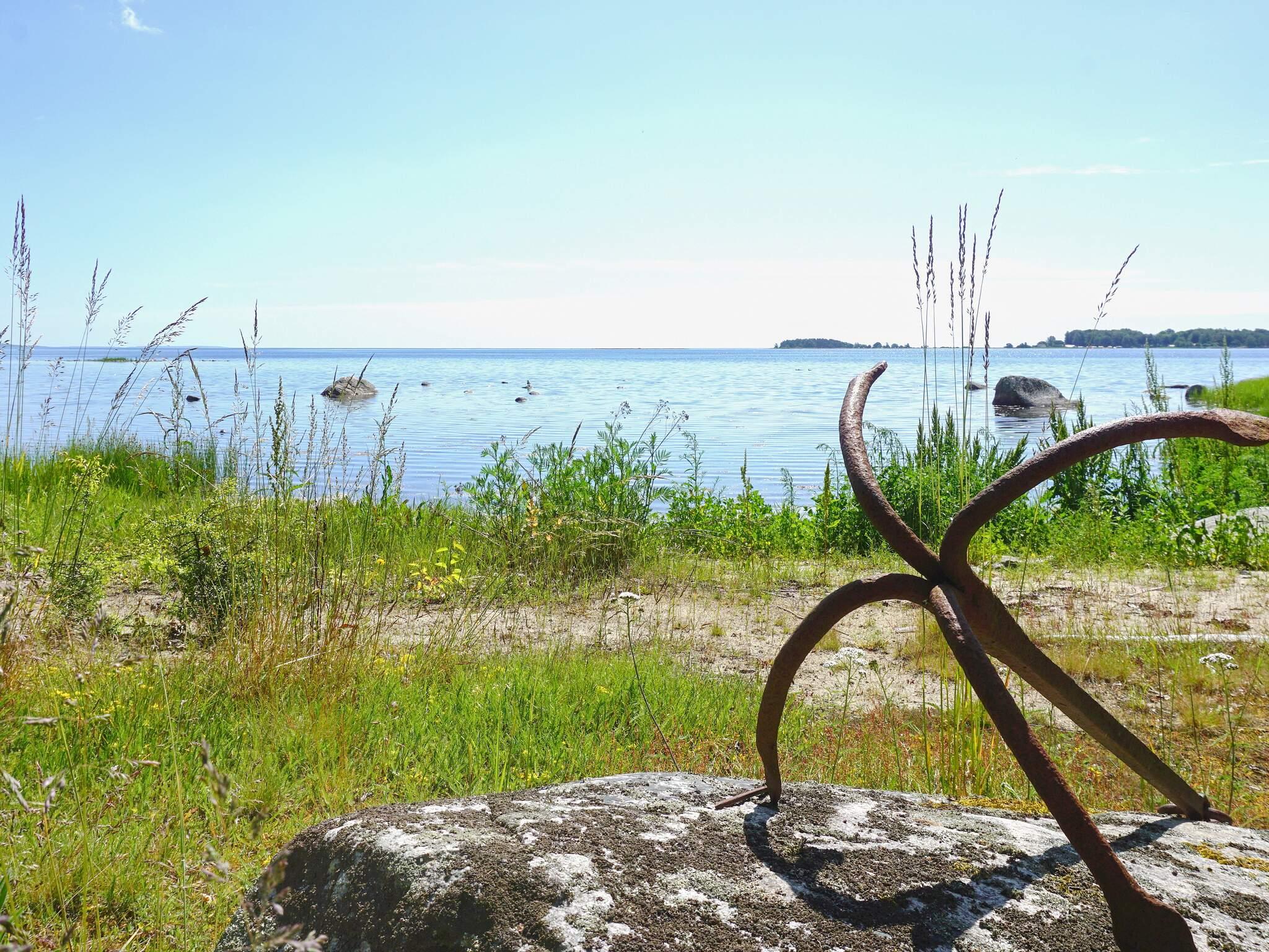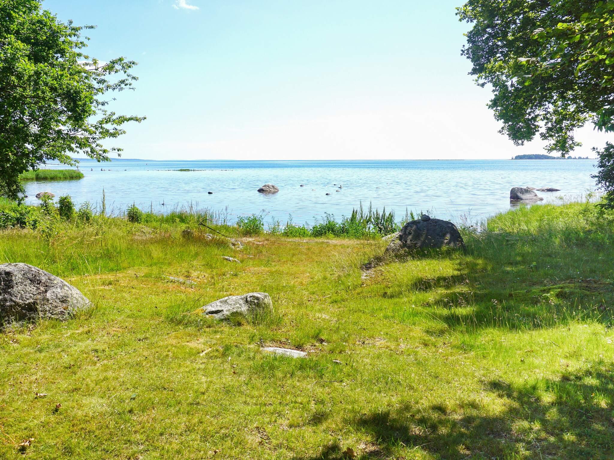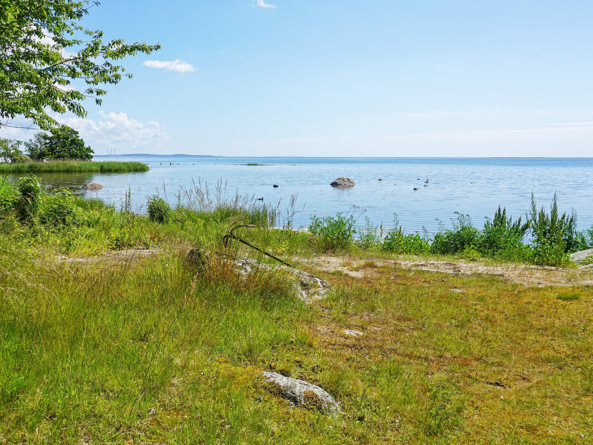 Vom Haus aus fällt das Grundstück leicht abwärts zum eigenen kleinen Strand. Mit Badeschuhen ist es absolut möglich, von hier aus zu schwimmen, aber wenn Sie zu einem größeren Badebereich gehen möchten, sind es nur wenige Kilometer zu einem Strand mit Sandstrand, Spielplatz usw.