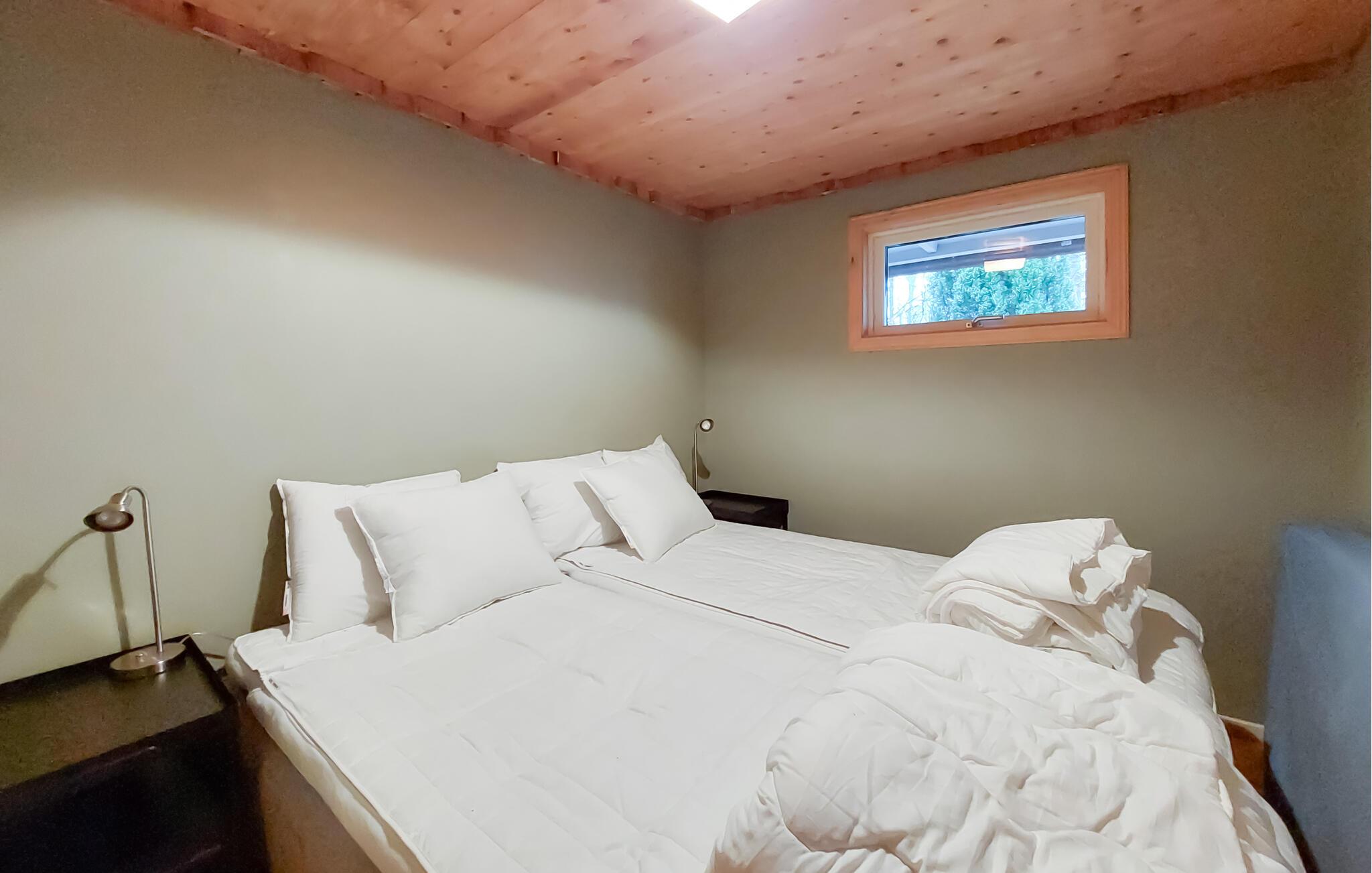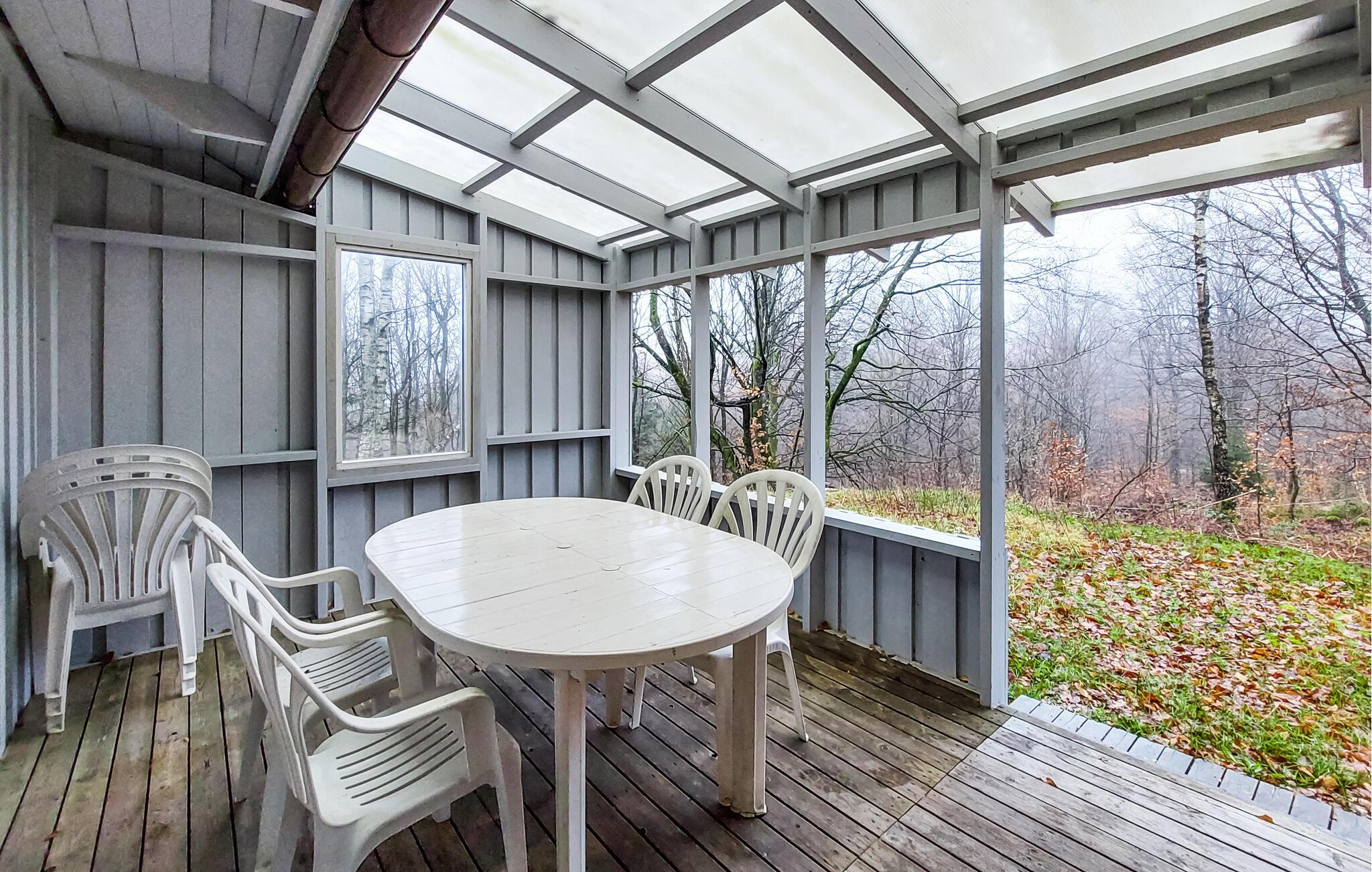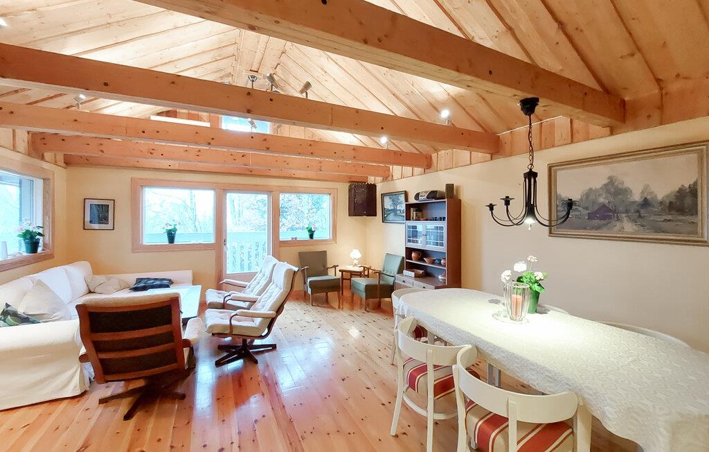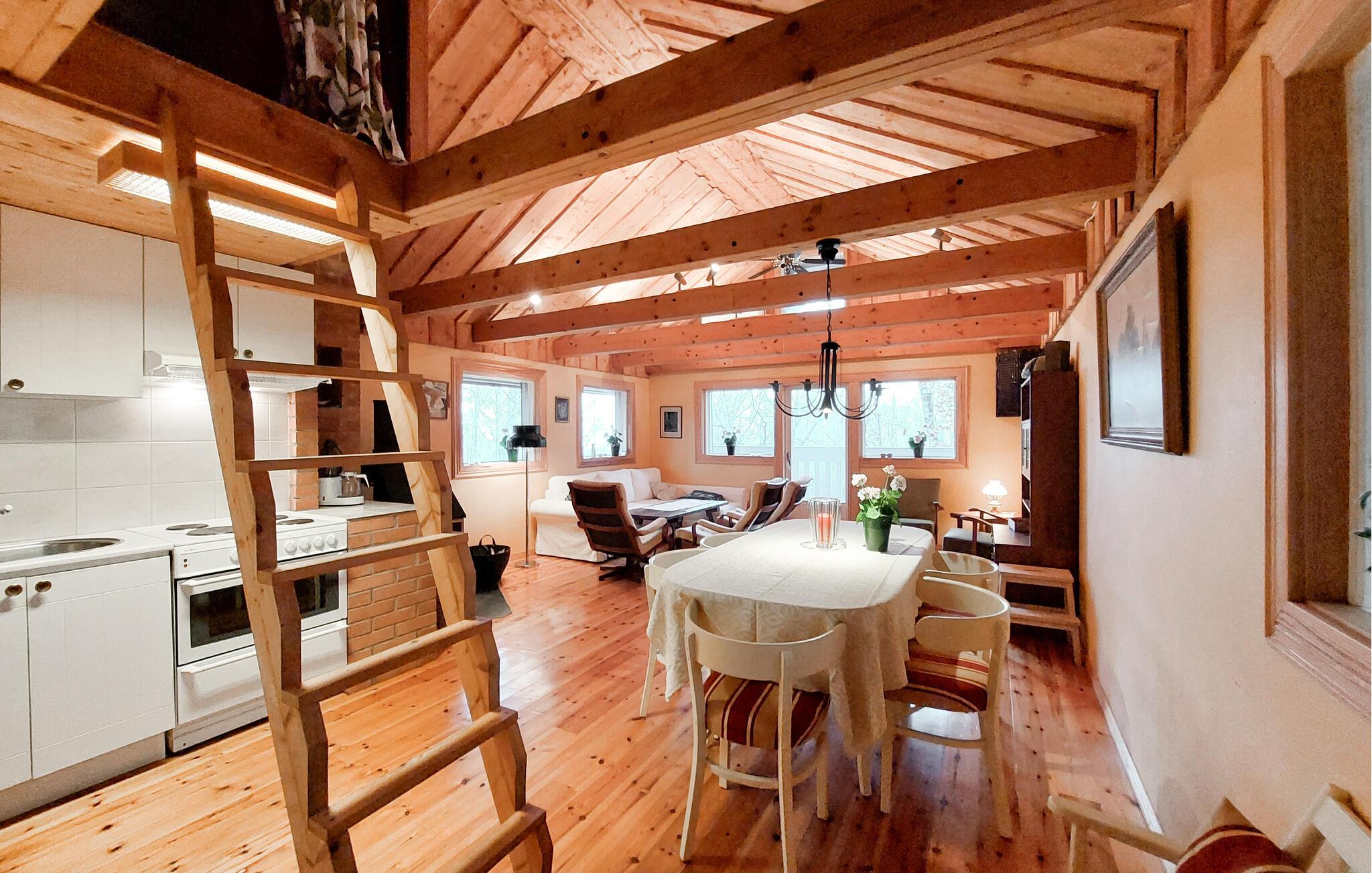 Ihr charmantes Ferienhaus mit hohen Decken und einer einladenden Lodge-Atmosphäre ist ideal für Naturliebhaber und Ruhesuchende. Treten Sie auf die überdachte Veranda hinaus und genießen Sie den Blick in den Wald. Dies ist der ideale Ort für Ihr Frühstück oder ein Abendessen im Freien. Im Inneren erwartet Sie ein offener Wohnbereich mit warmen Holztönen und großen Fenstern, die viel Licht hereinlassen. Entspannen Sie auf der bequemen Sofaecke vor dem Kamin und lassen Sie die Abende in gemütlicher Atmosphäre ausklingen. Nehmen Sie ein Buch zur Hand oder genießen Sie einfach die Ruhe. Kochen Sie Ihre Lieblingsgerichte in der Küche und servieren Sie sie am großen Esstisch, der Platz für die ganze Familie bietet.