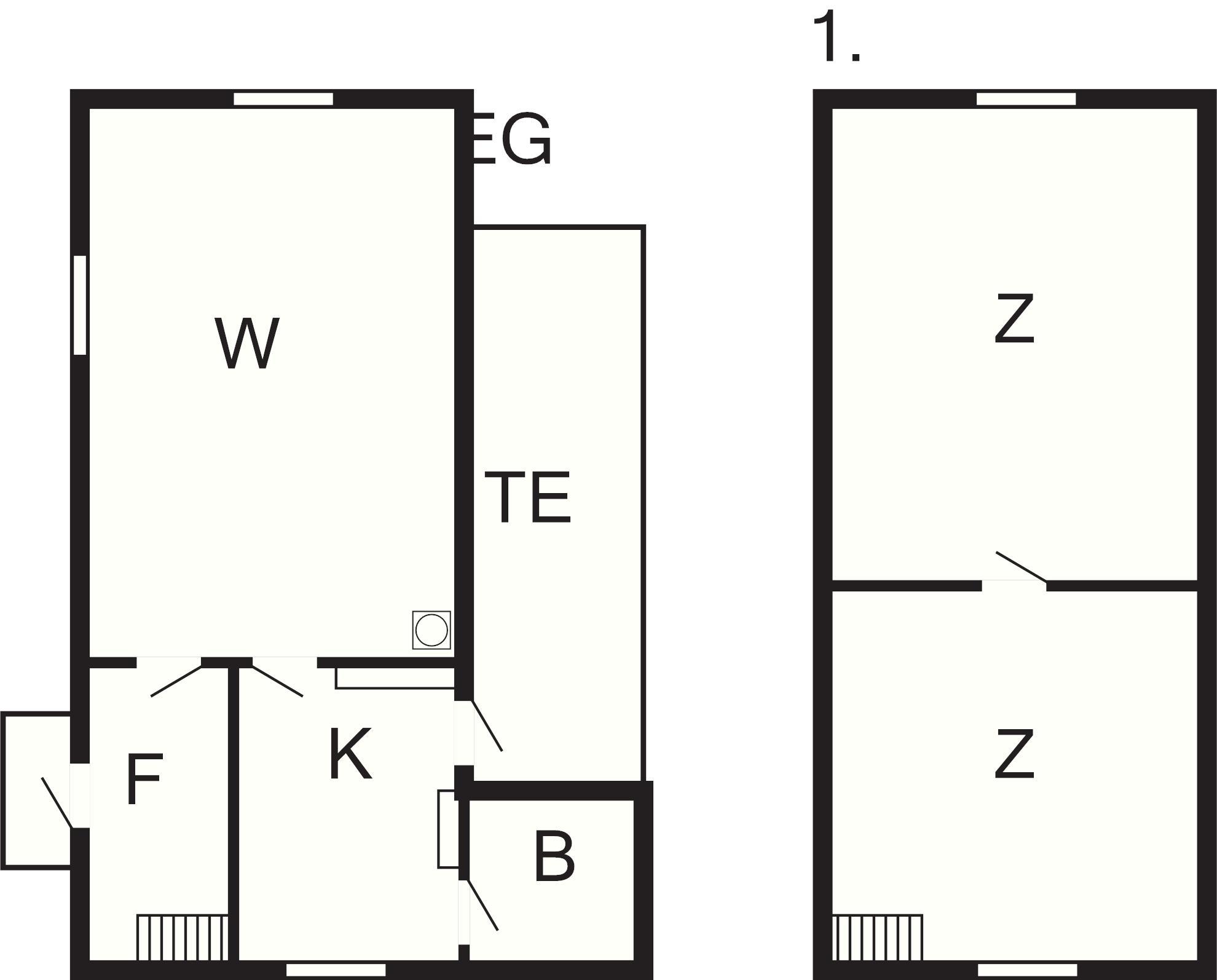 Die Küche ist eine kompakte Kochnische mit Herdplatten, Kaffeemaschine und Mikrowelle. Im Wohnzimmer sorgt ein offener Kamin für eine gemütliche Atmosphäre und lädt zu entspannten Abenden ein, wenn es draußen kühler wird. Das Ferienhäuschen stammt aus dem 19. Jahrhundert und hat seinen historischen Charme bewahrt. Die Deckenhöhe im Obergeschoss beträgt 185 cm, typisch für Häuser aus dieser Zeit. Bitte beachten Sie, dass die Treppe ins Obergeschoss steil ist.