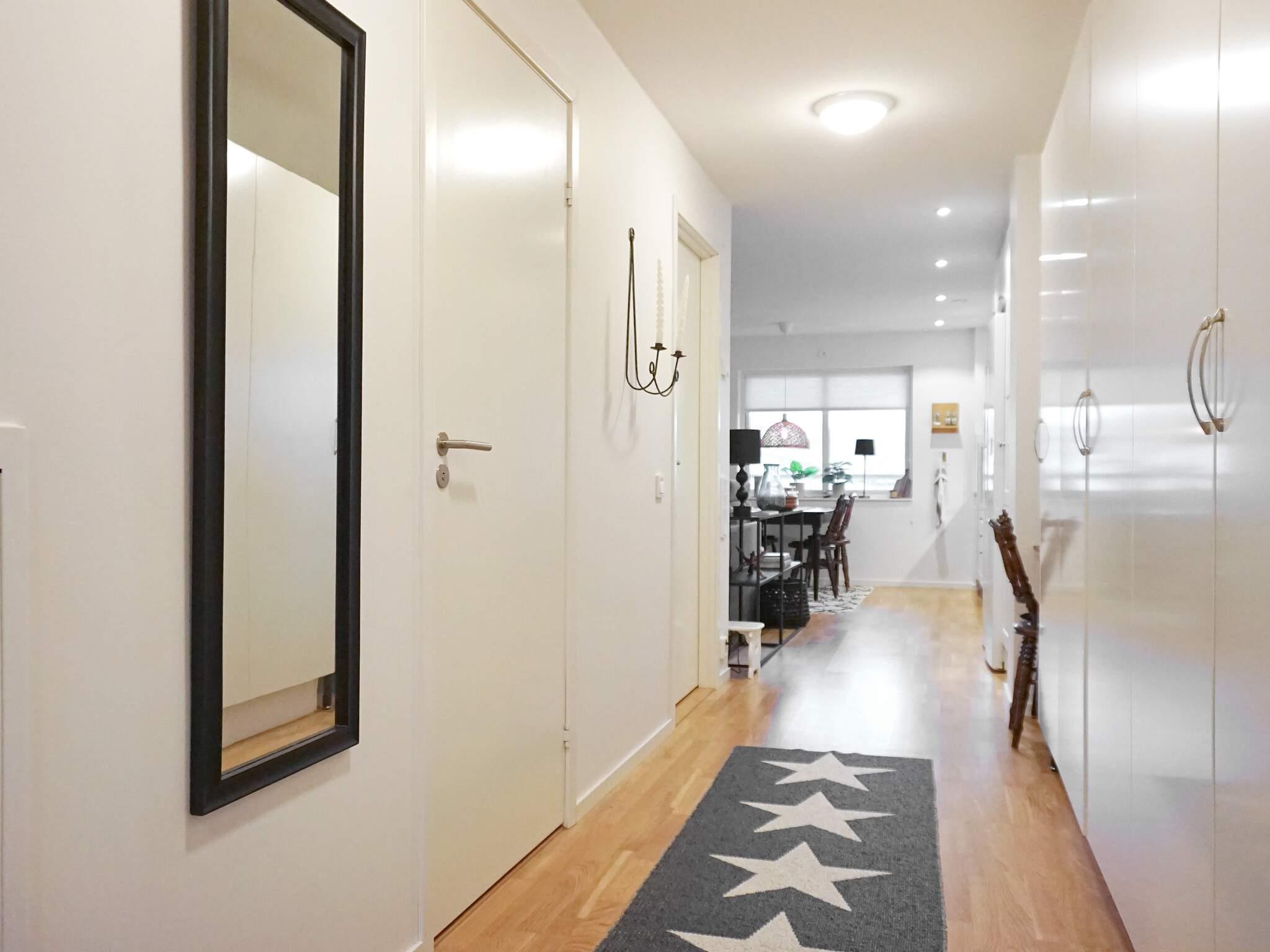 Die ebenerdige Wohnung ist eine Eckwohnung im ersten Obergeschoss, mit zugehörigem Balkonbereich. Zugang hat man über einen gemeinsamen Eingang, einen Aufzug und einen Flur im Dachgeschoss. Die Wohnung liegt mit freiem Blick nach Westen/Nordwesten, was Möglichkeiten für schöne sonnige Tage und Abende draußen auf dem Balkon bietet.