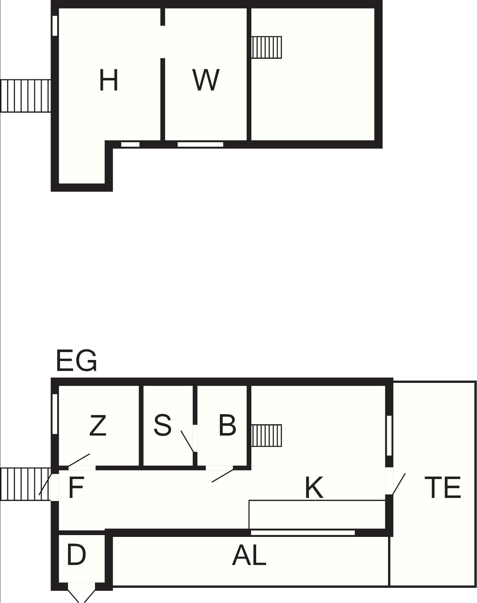 Vom Küchen-/Essbereich führt eine steile Treppe hinauf ins Dachgeschoss. Dort liegt das zweite Schlafzimmer des Hauses, mit Doppel- und Einzelbett, sowie das Familienzimmer mit Sitzecke und einem Schlafsofa für 1 Person. Zur umfassenden Ausstattung des Ferienhauses gehören auch Annehmlichkeiten wie ein Trockenschrank, Waschmaschine und Sauna.