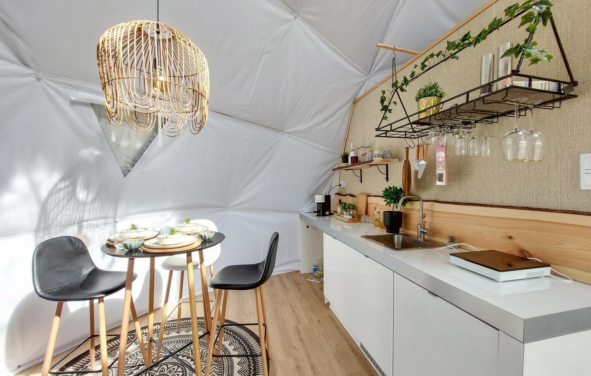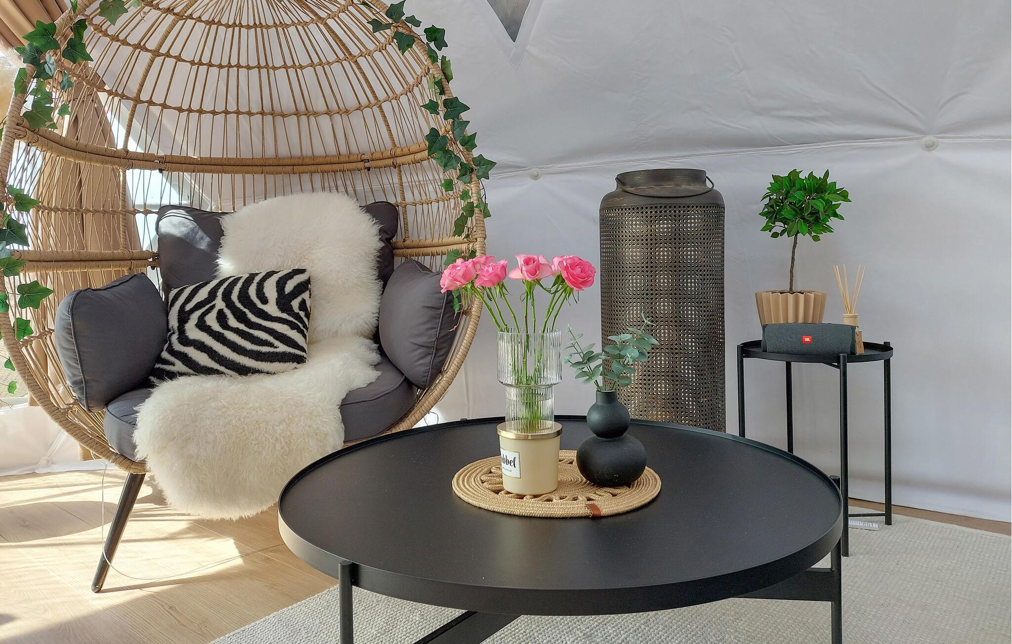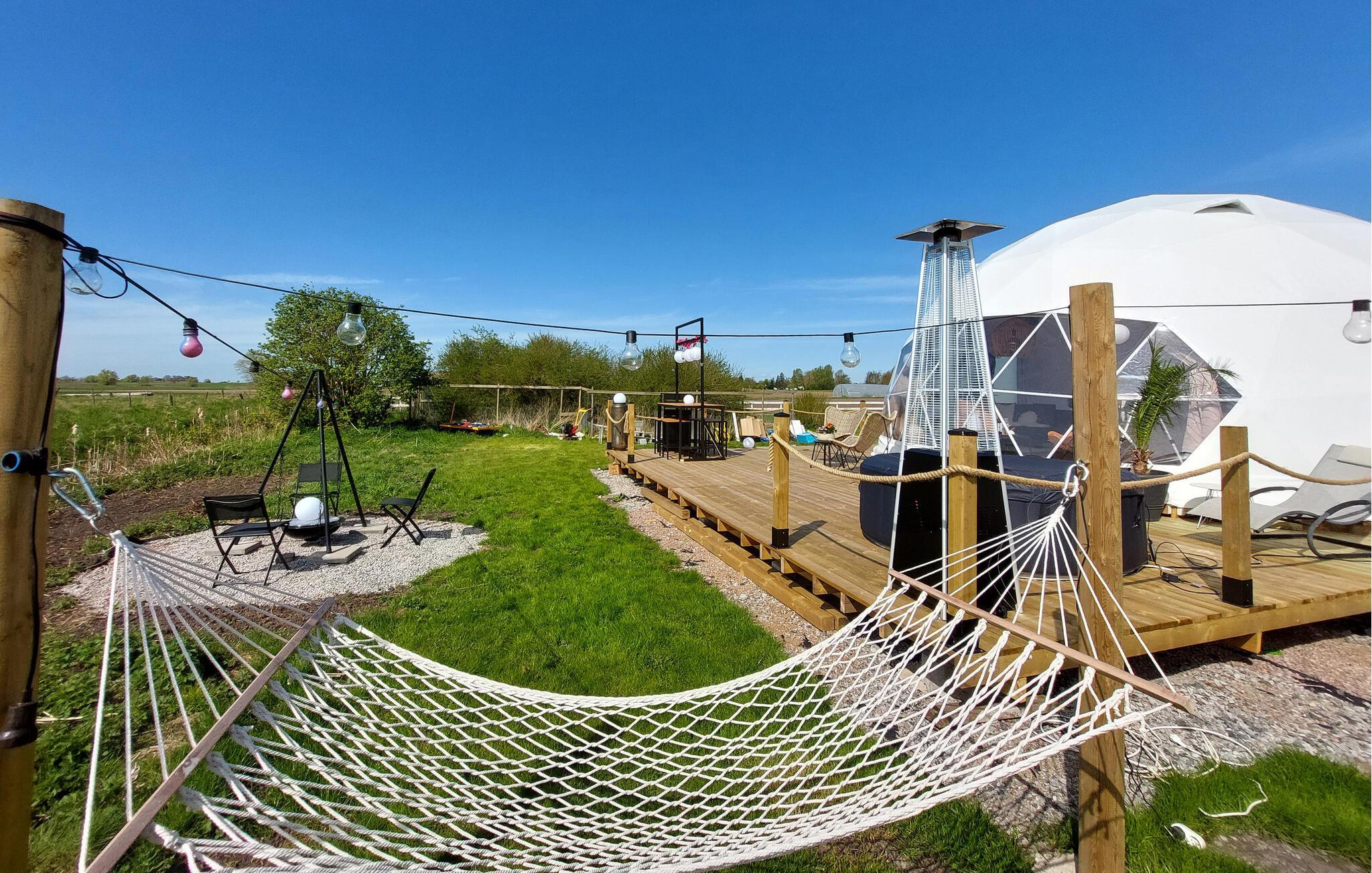 Willkommen im exklusiven Glamping Dome, wo jeder Sonnenuntergang ein magisches Erlebnis ist. Diese moderne Oase bietet eine komfortablen Rückzugsort vom Alltag. Machen Sie es sich hier mit Ihren Lieben so richtig gemütlich und lassen Sie den Blick weit über die Landschaft schweifen. Genießen Sie das sanfte Schaukeln der bequemen Hängematte, während Sie den Geräuschen der Natur lauschen und die kühle Brise spüren. Dies ist der ideale Ort, um zu entspannen und die Ruhe der umliegenden Natur zu genießen.