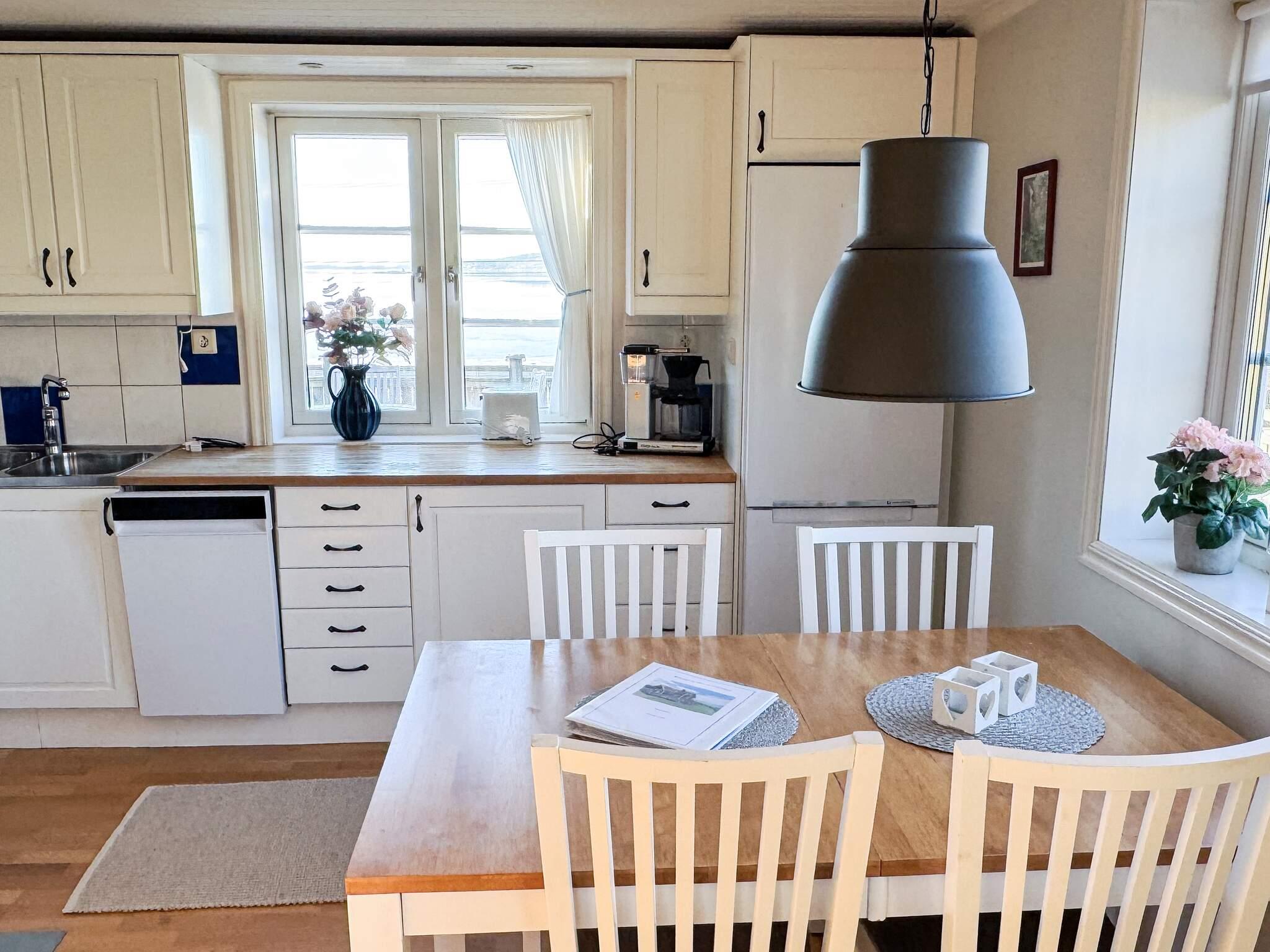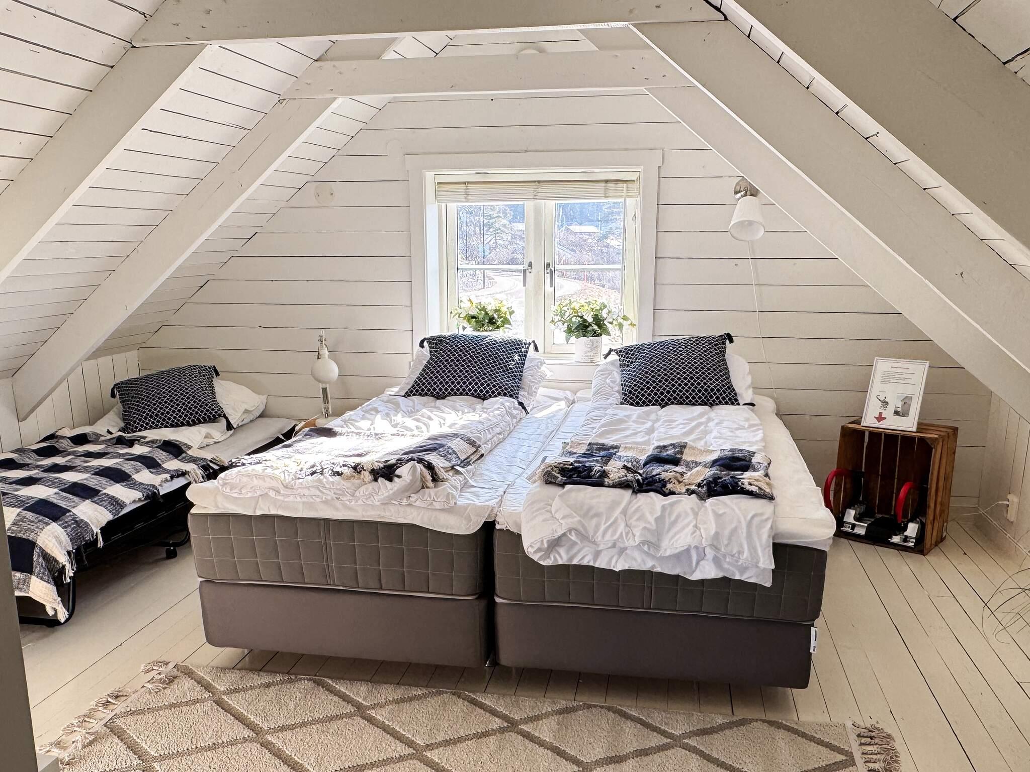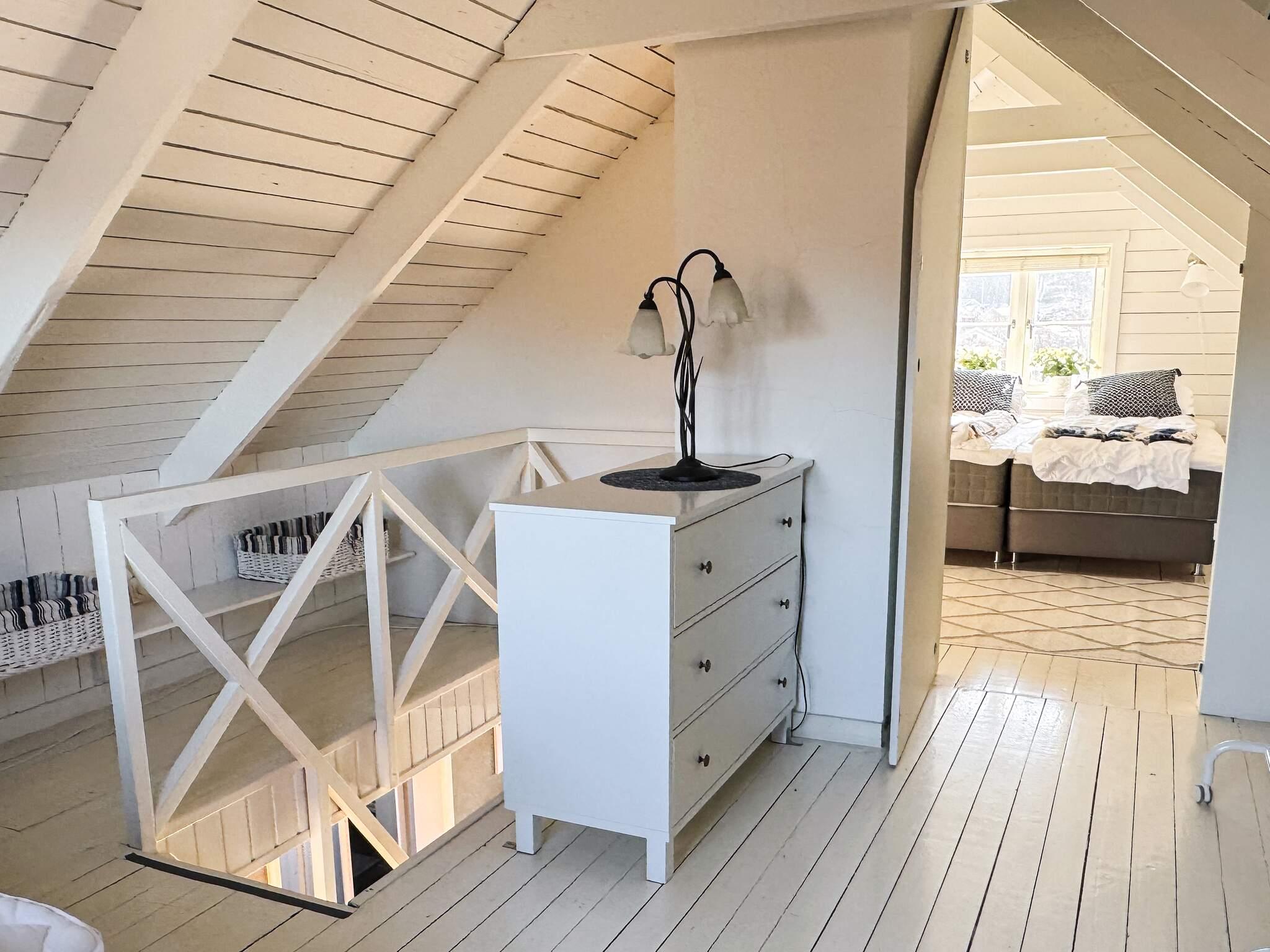 Der Dachboden hat eine etwas niedrigere Deckenhöhe, was zum gemütlichen Landhausgefühl beiträgt. Vom Wohnzimmer aus gelangt man in den verglasten Außenbereich mit einem schönen Rattan-Ecksofa und fantastischem Blick auf den Fjord. Auf der Terrasse stehen Gartenmöbel und ein Holzkohlegrill für lange Sommerabende bereit.