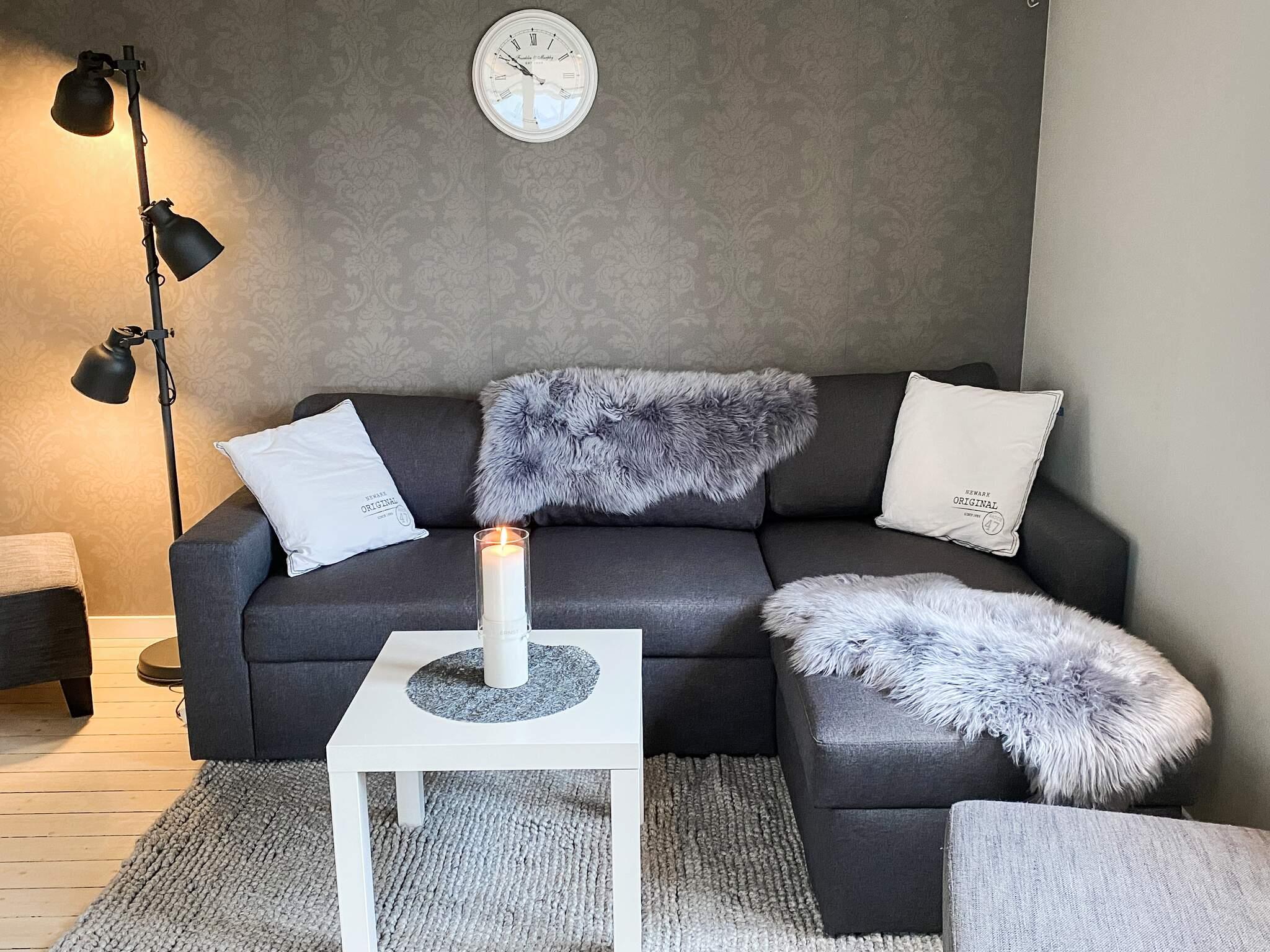 Im Wohnzimmer befinden sich ein Schlafsofa (160 cm), ein Fernseher mit Apple TV, ein Schreibtisch und zwei bequeme Sessel. Die Küche ist komplett ausgestattet mit Geschirrspüler, Kühl-/Gefrierschrank, Mikrowelle und Kaffeemaschine. Ein Küchentisch mit Stühlen ist ebenfalls vorhanden. Das Badezimmer verfügt über WC, Waschbecken, Dusche und Waschmaschine. Fußbodenheizung ist sowohl im Flur als auch in der Küche und im Bad vorhanden. Eine leicht steile Treppe führt zum Dachboden, wo sich zwei Einzelbetten (90 cm) befinden. Der Dachboden verfügt außerdem über ein Schlafzimmer mit einem Doppelbett (90 cm + 90 cm). Bei Bedarf steht ein Klappbett zur Verfügung.
