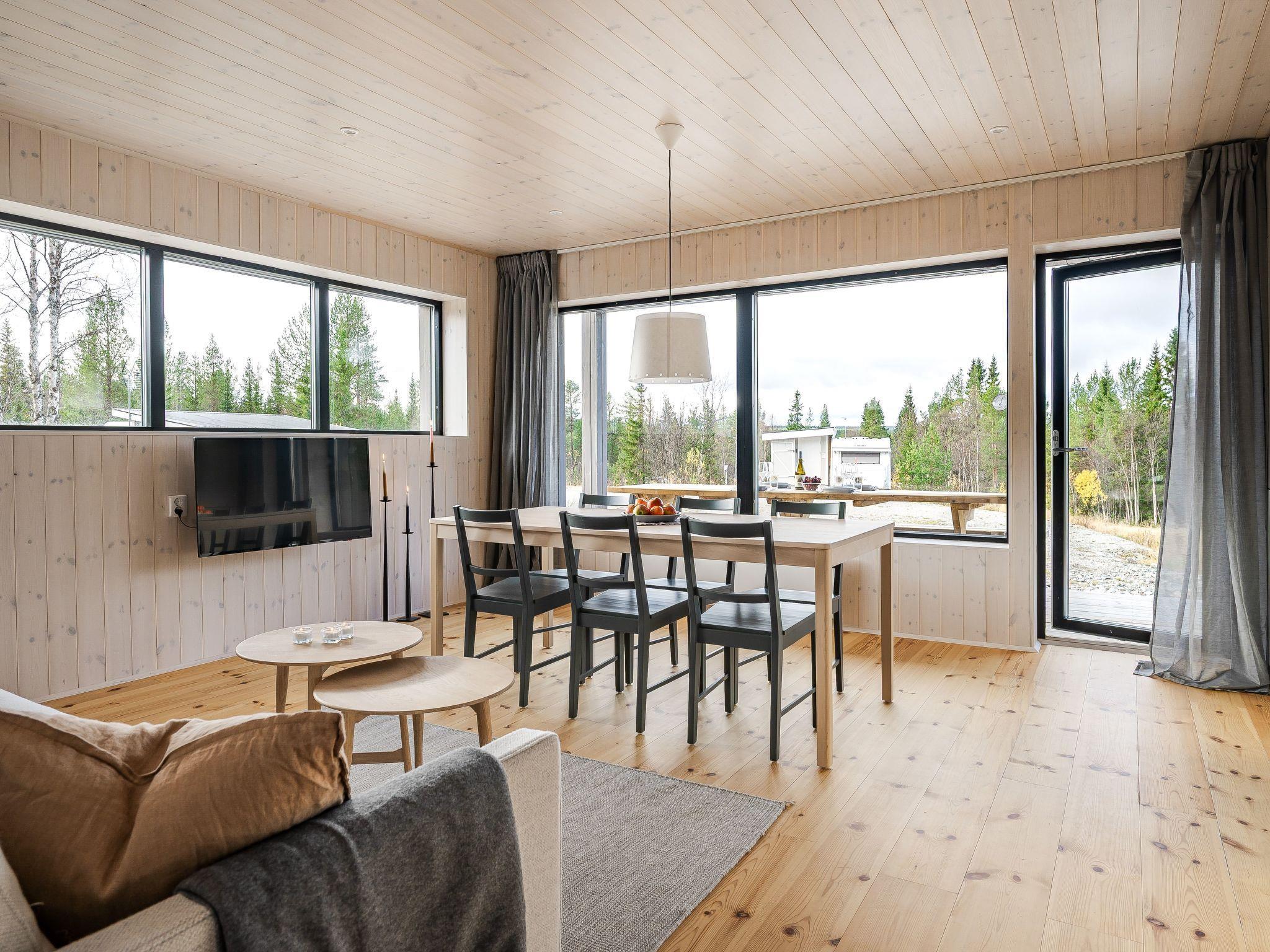 "Renstråket 1001", 3-room apartment 52 m2, on the ground floor. Bright, very modern and tasteful furnishings: open living/dining room with panoramic window. Exit to the terrace, south-west facing position. 1 double bedroom with 1 double bed (160 cm, length 200 cm). 1 large room with 1 bed (90 cm, length 200 cm), 1 x 1 bunk beds (90 cm, length 200 cm) (120 cm, length 200 cm). Open kitchen (oven, dishwasher, 4 ceramic glass hob hotplates, toaster, kettle, microwave, freezer, electric coffee machine). Shower/WC, Sauna. Electric heating. Parquet floors. Panoramic view of the mountains and the forest. Facilities: children's high chair, baby cot. Internet (WiFi, free). Please note: non-smoking house. Smoke alarm, fire extinguisher.