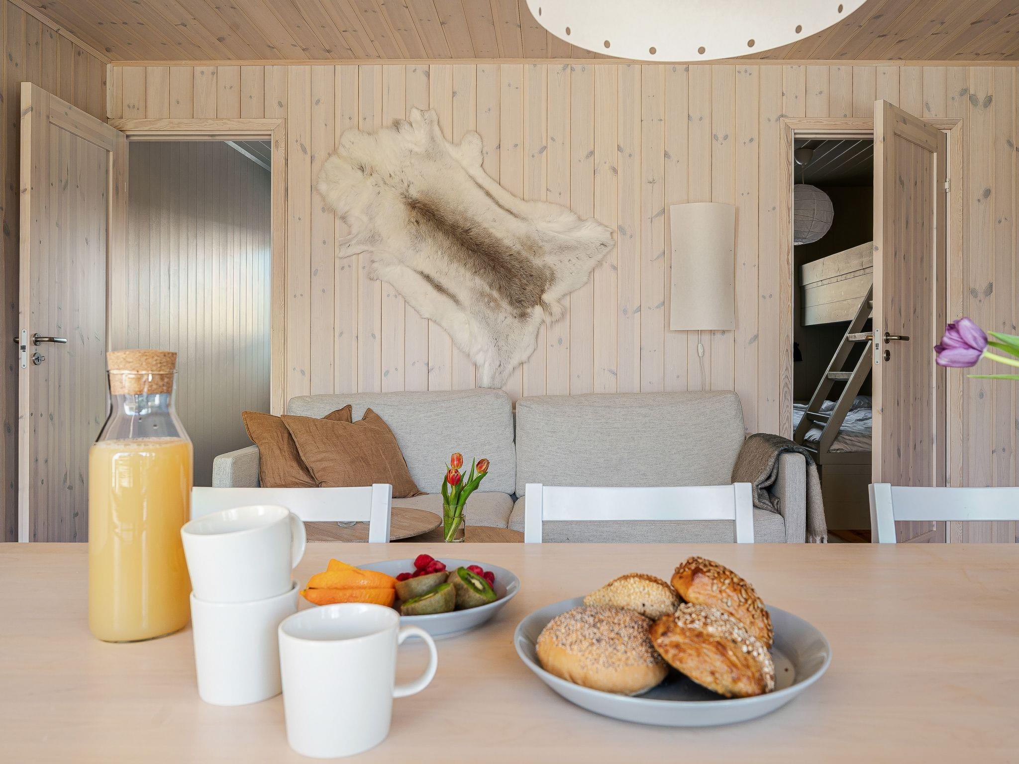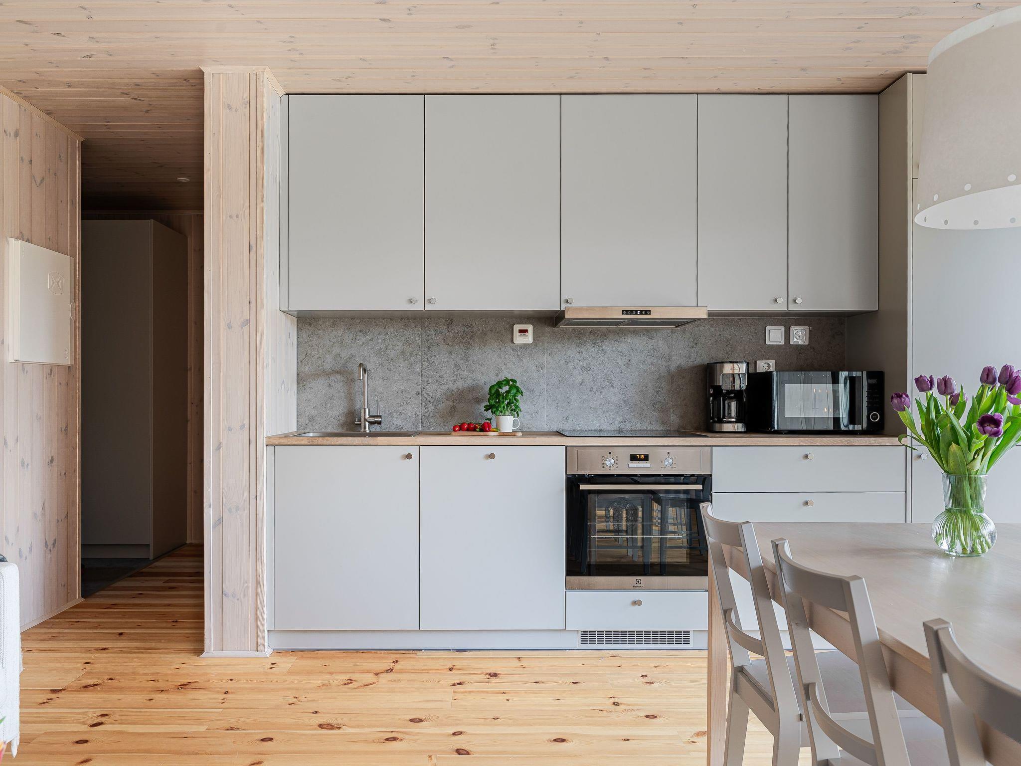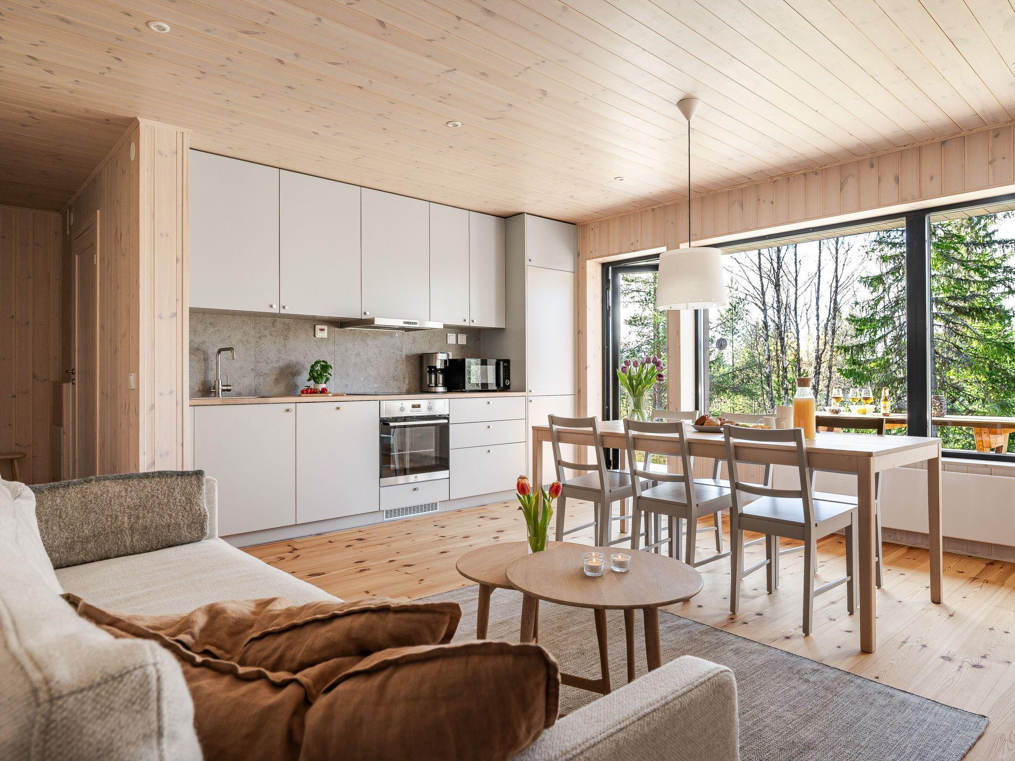 "Renstråket 1002", 3-room apartment 52 m2, on the ground floor. Bright, very modern and tasteful furnishings: open living/dining room with panoramic window. Exit to the terrace, south-west facing position. 1 double bedroom with 1 double bed (160 cm, length 200 cm). 1 large room with 1 x 1 bunk beds (90 cm, length 200 cm) (120 cm, length 200 cm). Open kitchen (oven, dishwasher, 4 ceramic glass hob hotplates, toaster, kettle, microwave, freezer, electric coffee machine). Shower/WC, Sauna. Electric heating. Parquet floors. Panoramic view of the mountains and the forest. Facilities: children's high chair, baby cot. Internet (WiFi, free). Please note: non-smoking house. Smoke alarm, fire extinguisher.