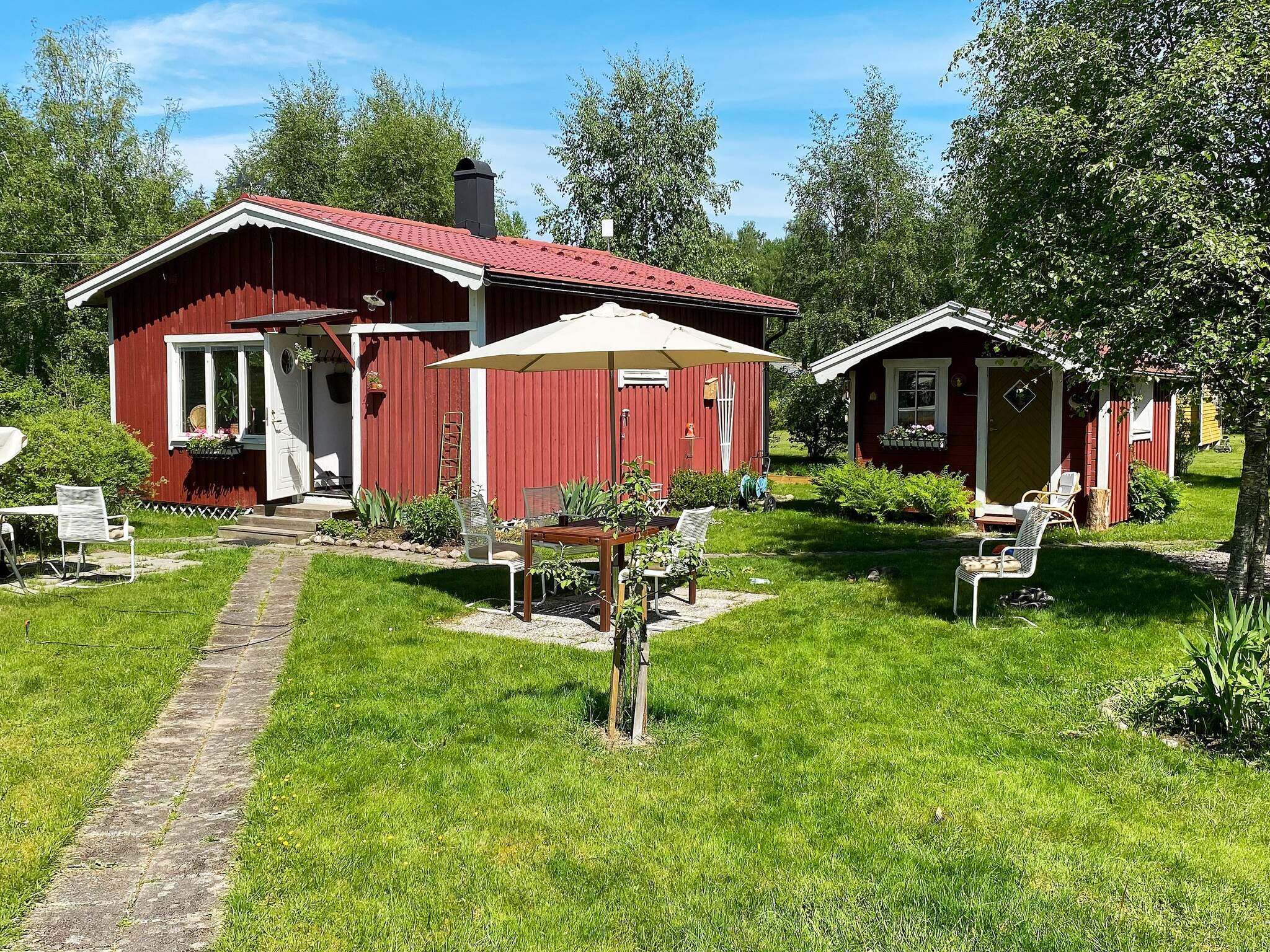 Nebenan auf dem Grundstück steht der kleinere Annex mit Etagenbett, einem kleinen Tisch und Stühlen. Insgesamt stehen vor Ort somit vier Schlafplätze bereit. Das Ferienhäuschen liegt bei Skaraborg, einem Gebiet zwischen den Seen Vänern und Vättern.