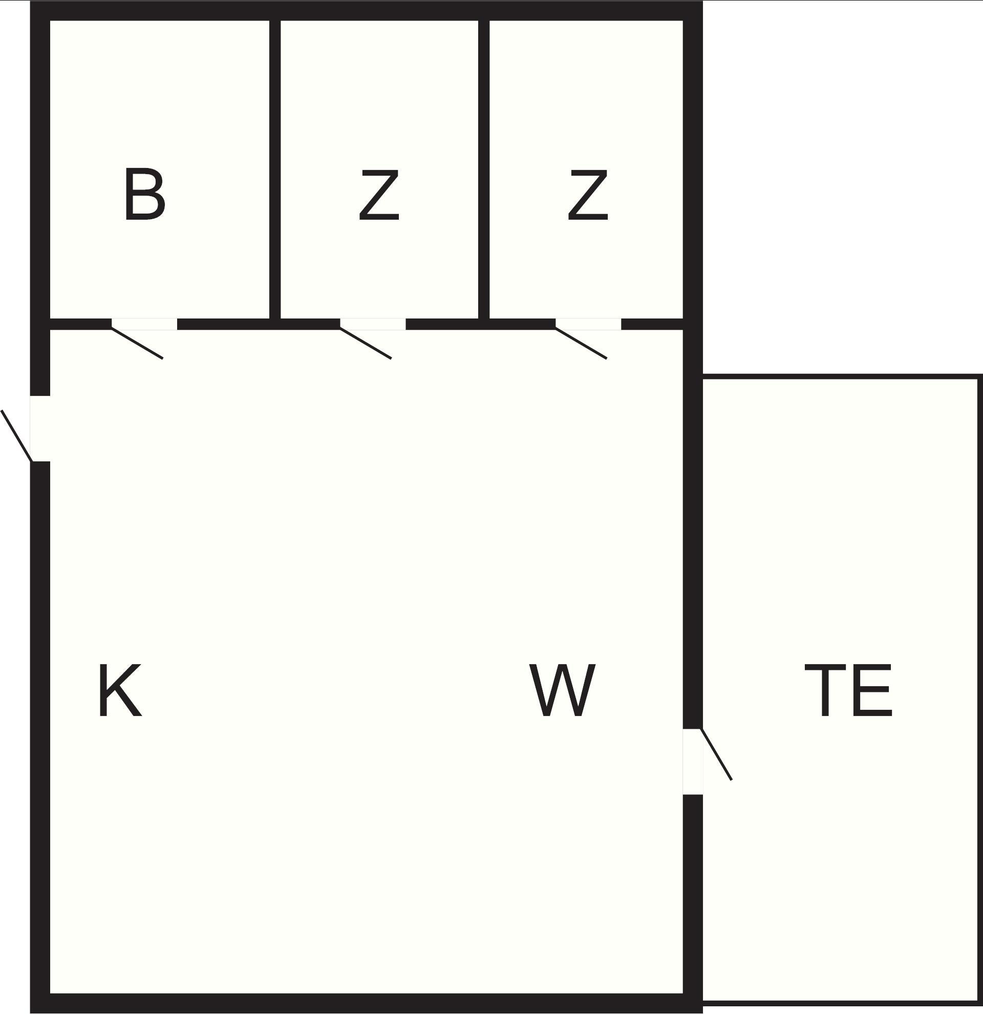 Das Ferienhaus selbst besteht aus einem hellen Küchen-/Aufenthaltsbereich mit einer ausziehbaren Schlafliege und zwei Stühlen als Sitzgelegenheit am Esstisch. Von hier hat man Zutritt zur Terrasse davor. Außerdem zwei kleinere Schlafzimmern mit jeweils einem Etagenbett, eines davon schmaler, mit nur 70 cm Breite. Die Einrichtung ist funktional und schlicht.
