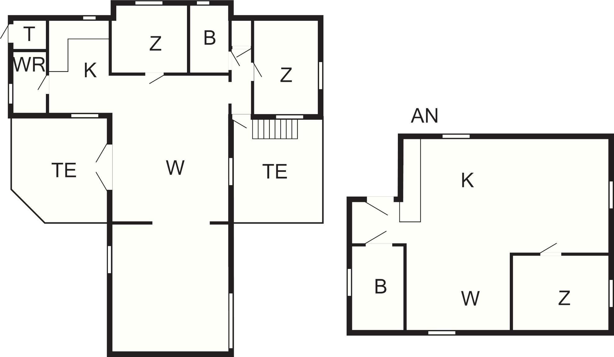 Das kleinere Haus verfügt über ein großes Schlafzimmer mit Doppelbett und ein kleineres Zimmer mit einem 90-cm-Bett. Zusätzlich befindet sich im kleinen Wohnzimmer ein Bett mit 105 cm Breite. Das Gästehaus ist mit Küche und WC ausgestattet, jedoch ohne Dusche. Duschmöglichkeiten gibt es im Haupthaus oder im Saunahaus sowie eine Außendusche am Pool.