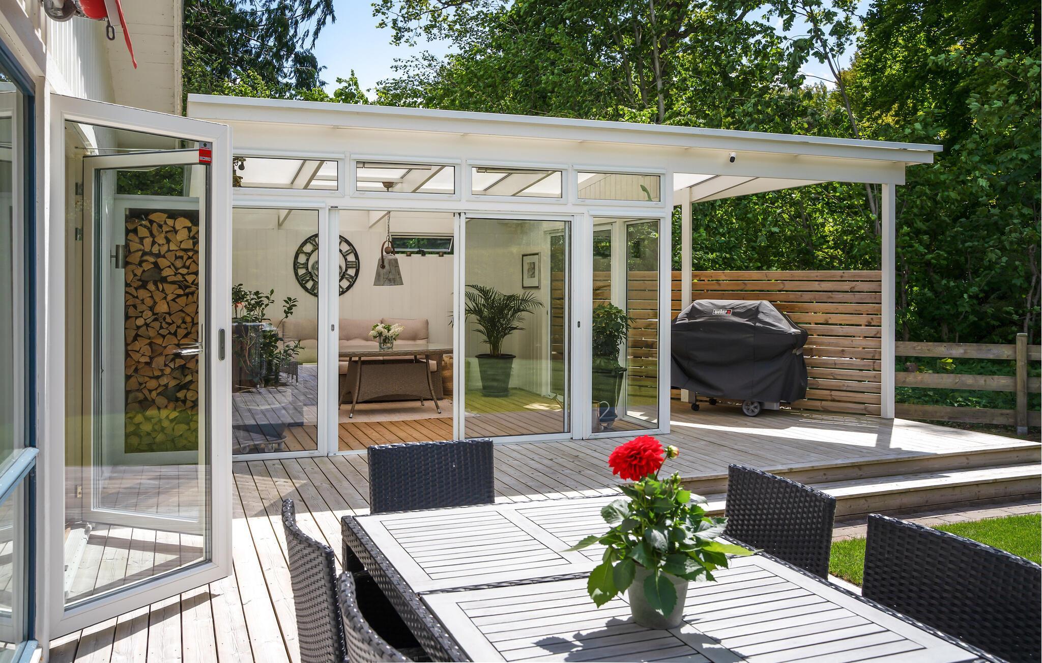 Dieses großzügige und mit hohem Komfort ausgestattete Ferienhaus heißt Sie mit einem geräumigen und geschmackvoll eingerichteten Interieur willkommen, in dem große Fensterfronten für viel natürliches Tageslicht sorgen. Freuen Sie sich auf entspannte Mahlzeiten und harmonische Spieleabende am stilvollen Esstisch sowie auf gemütliche Filmabende im einladenden Wohnzimmer. Plaudern Sie abends bei einem Glas Wein im schönen Wintergarten.