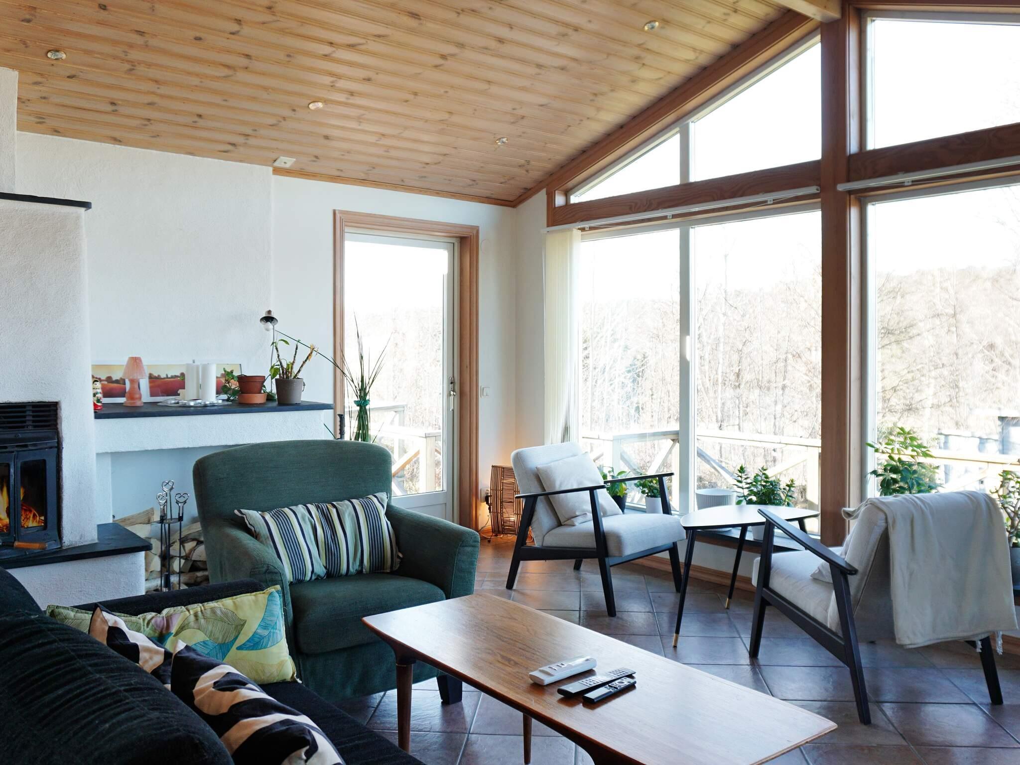 Über eine Treppe erreichen Sie den Eingang des Hauses. Im Inneren erwarten Sie ein Flur mit Zugang weiter zur großen, offenen Küche mit Essecke und offenem, großen Wohnbereich. Von dort schaut man durch die großen Fenster hinaus in den Garten. Der Küchenteil mit Kochinsel ist mit Herd, separatem Backofen, Mikrowelle, Kühl-/Gefrierschrank, Kaffeemaschine und Geschirrspüler ausgestattet. Das gemütliche Wohnzimmer verfügt über einen wärmenden Holzofen, bequeme Sessel sowie ein Schlafsofa für eine Person und einen Fernseher. Freies WLAN im Haus.
