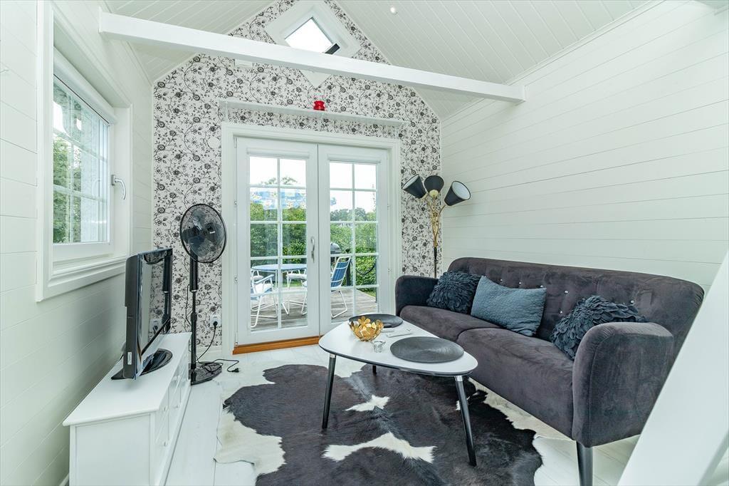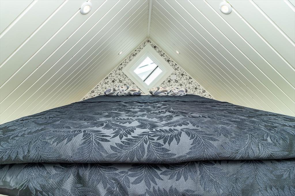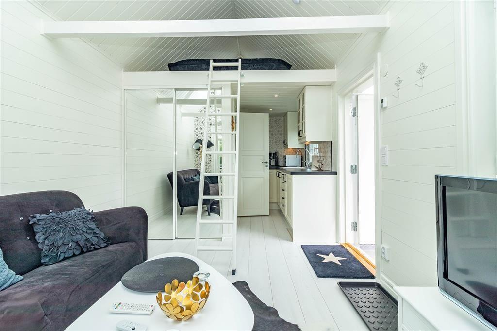 Das kleine, gemütliche Ferienhaus bietet auf etwa 15 m² Platz für 2 Personen. Du betrittst den offenen Wohn‑ und Küchenbereich, in dem alles für einen entspannten Aufenthalt bereitsteht: die Küche ist ausgestattet mit 4‑Platten‑Cerankochfeld und Backofen, Kühlschrank mit Gefrierfach, Mikrowelle, Dunstabzugshaube und Kaffeemaschine. Das Badezimmer verfügt über WC und Dusche. Der Wohnbereich lädt auf dem Sofa zum Entspannen ein, während du über den TV mit Google Chromecast deine Lieblingssendungen streamen kannst. Vom Wohnraum gelangst du auf die Terrasse, die mit Terrassenmöbeln und einem Grill ausgestattet ist – ideal für laue Sommerabende. Über eine Leiter erreichst du das Schlafloft mit einem Doppelbett; beachte bitte, dass die Leiter steil ist und das Schlafloft kein Geländer hat. Im Außenbereich stehen Parkplatz und eine E‑Auto‑Ladestation bereit, die du gegen Gebühr nutzen kannst. Zudem kannst du Internet, ein Kanu und zwei Fahrräder nutzen.