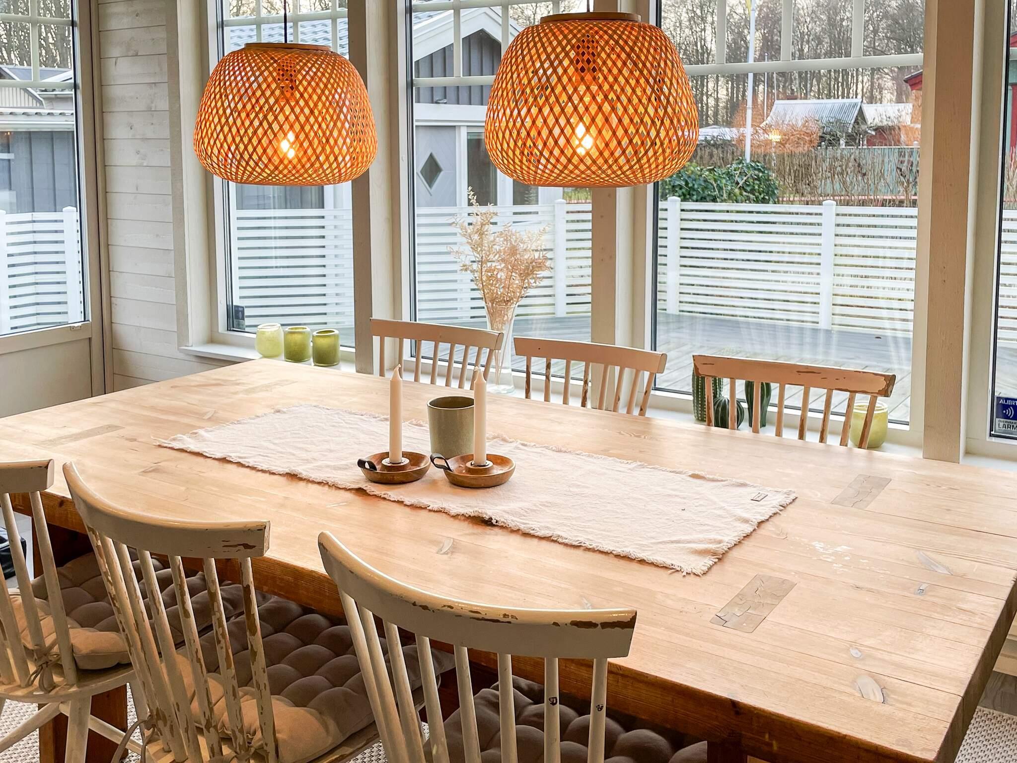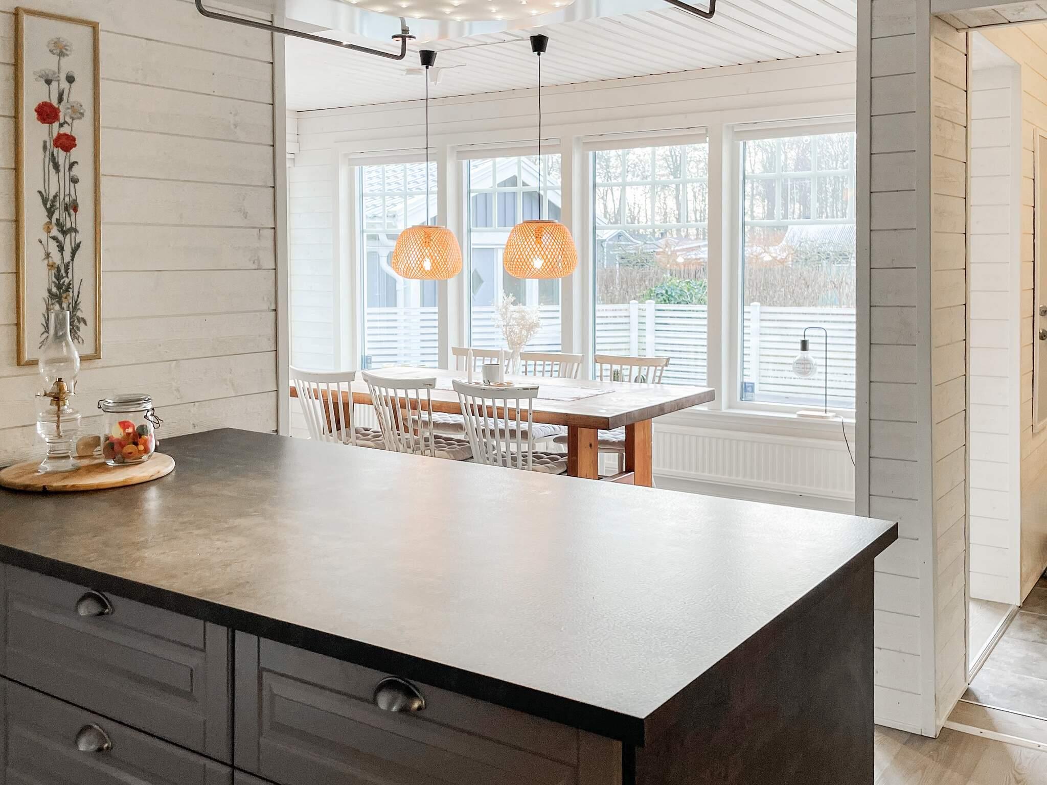 Durch ein Tor im Zaun, der auf beiden Seiten des Hauses verläuft, erreichen Sie den Eingang an der Vorderseite des Hauses. Der geräumige Flur führt Sie in die voll ausgestattete Küche mit Kücheninsel. Offener Grundriss mit Sofa, das als Bett für zwei Personen vor dem Fernseher mit Chromecast verwendet werden kann. Essbereich um einen Tisch mit Stühlen. Die großen Fenster sorgen für angenehmes Licht und Ausblicke über große Teile der Terrasse. Es gibt auch zwei Schlafzimmer; eines mit einem Doppelbett, das andere mit einem 120 cm langen Einzelbett. Das helle Badezimmer verfügt neben einem Waschbecken und einer Toilette über eine Dusche und eine Waschmaschine.