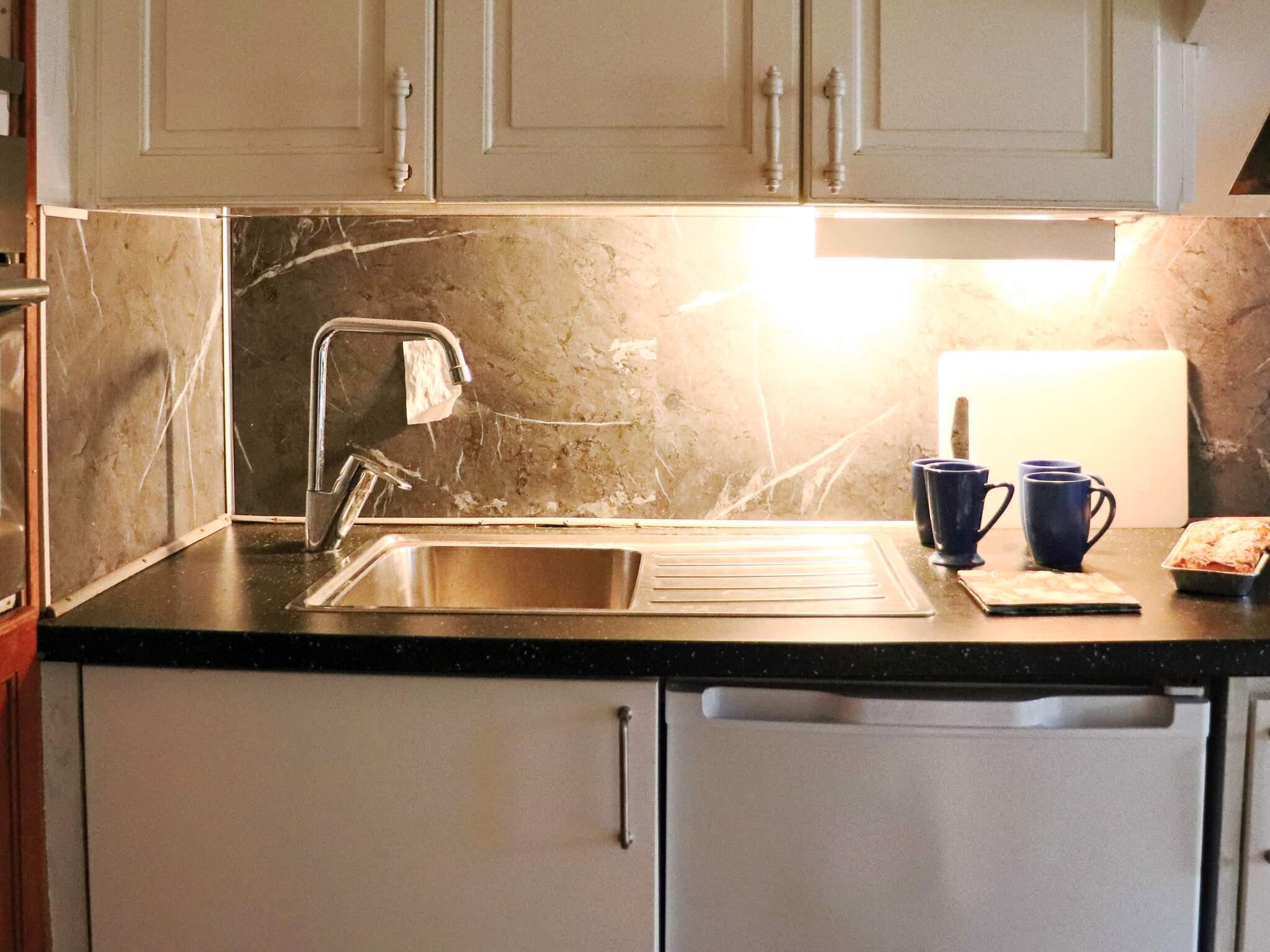 Küche: E-Kochpl., Ofen, Kühlschr. m. Gefrierfach, Mikrow., Kaffeem., Spülm.