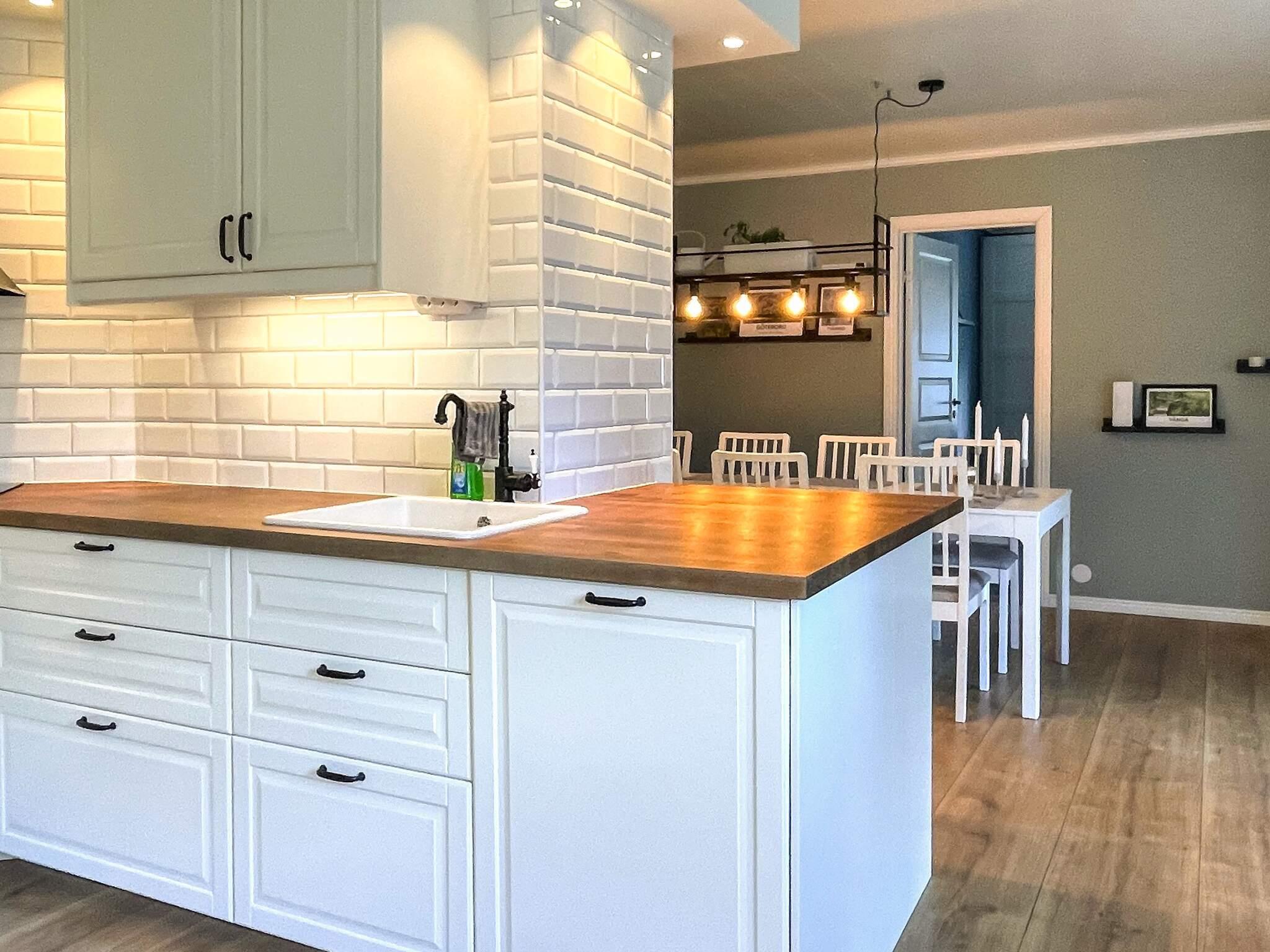Auf drei harmonisch gestalteten Etagen bietet das Haus Platz für bis zu acht Personen – ideal für Familien oder befreundete Paare. Die Schlafräume sind komfortabel eingerichtet: Zwei Doppelbettzimmer mit Betten der Größe 180 × 200 cm, ein Einzelzimmer mit 90 × 180 cm, ein Etagenbettzimmer mit zwei Matratzen je 90 × 180 cm, sowie ein separates Zimmer mit einem ausklappbaren Ecksofa (140 × 200 cm) bieten flexible und gemütliche Schlafmöglichkeiten. Drei stilvolle Badezimmer – darunter ein großzügiger Duschbereich mit zwei Regenduschen – sorgen für hohen Komfort. Eines der Bäder im Obergeschoss verfügt zudem über einen praktischen Wickeltisch – besonders für Familien mit kleinen Kindern ein Plus. Im Zentrum des Hauses liegt die helle, voll ausgestattete Küche mit ländlichem Charme und moderner Technik: großer Kühlschrank, großer Gefrierschrank, Mikrowelle, Backofen, Geschirrspüler, Kaffeevollautomat, Wasserkocher und Toaster stehen bereit. Am großen Esstisch mit Platz für acht Personen beginnt jeder Urlaubstag entspannt.