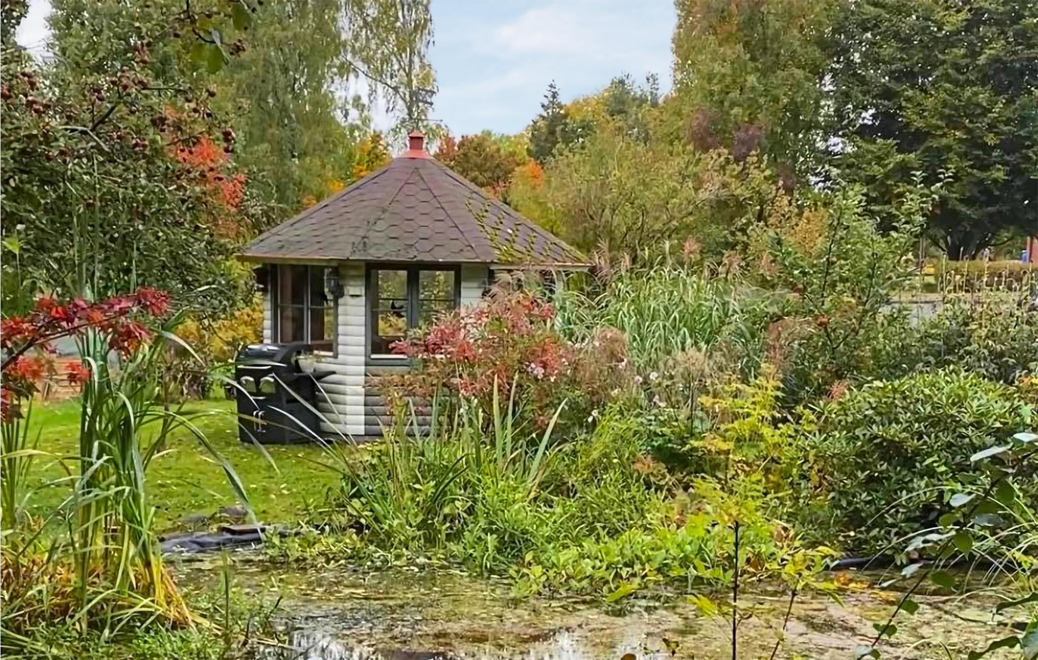 Genießen Sie auf der Terrasse die Sonne und leckere Gerichte vom Grill. Ein voll ausgestatteter Pavillon lädt zu geselligen Stunden bei jeder Witterung ein, hier befindet sich auch ein kleiner Teich.