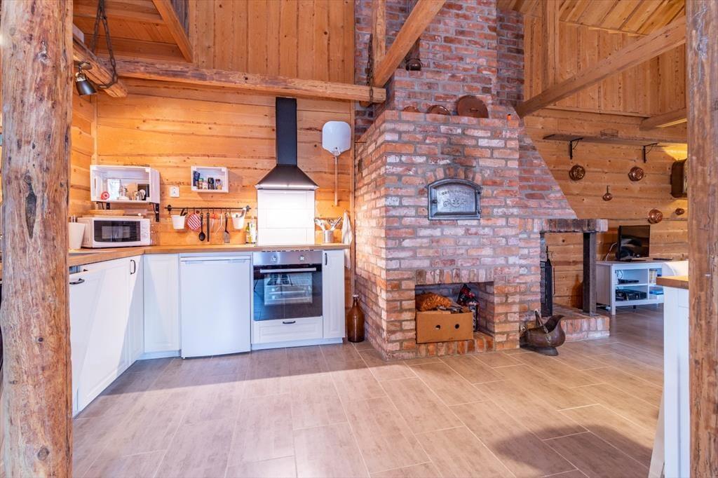 I den åbne stue-, spise- og køkkenafdeling sørger gulvvarme for behagelig temperatur. Køkkenet er fuldt udstyret med opvaskemaskine, 4-pladers keramisk kogeplade, stenovn, emhætte, køle-/fryseskab, mikrobølgeovn og kaffemaskine.