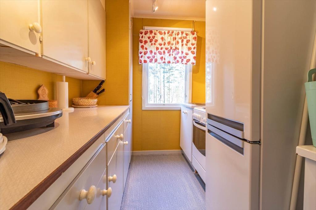 Køkkenet er udstyret med 4-plade komfur med ovn, køle-/fryseskab og kaffemaskine – alt, hvad du behøver til afslappede feriedage. I badeværelset er der toilet, bruser og en praktisk topbetjent vaskemaskine.