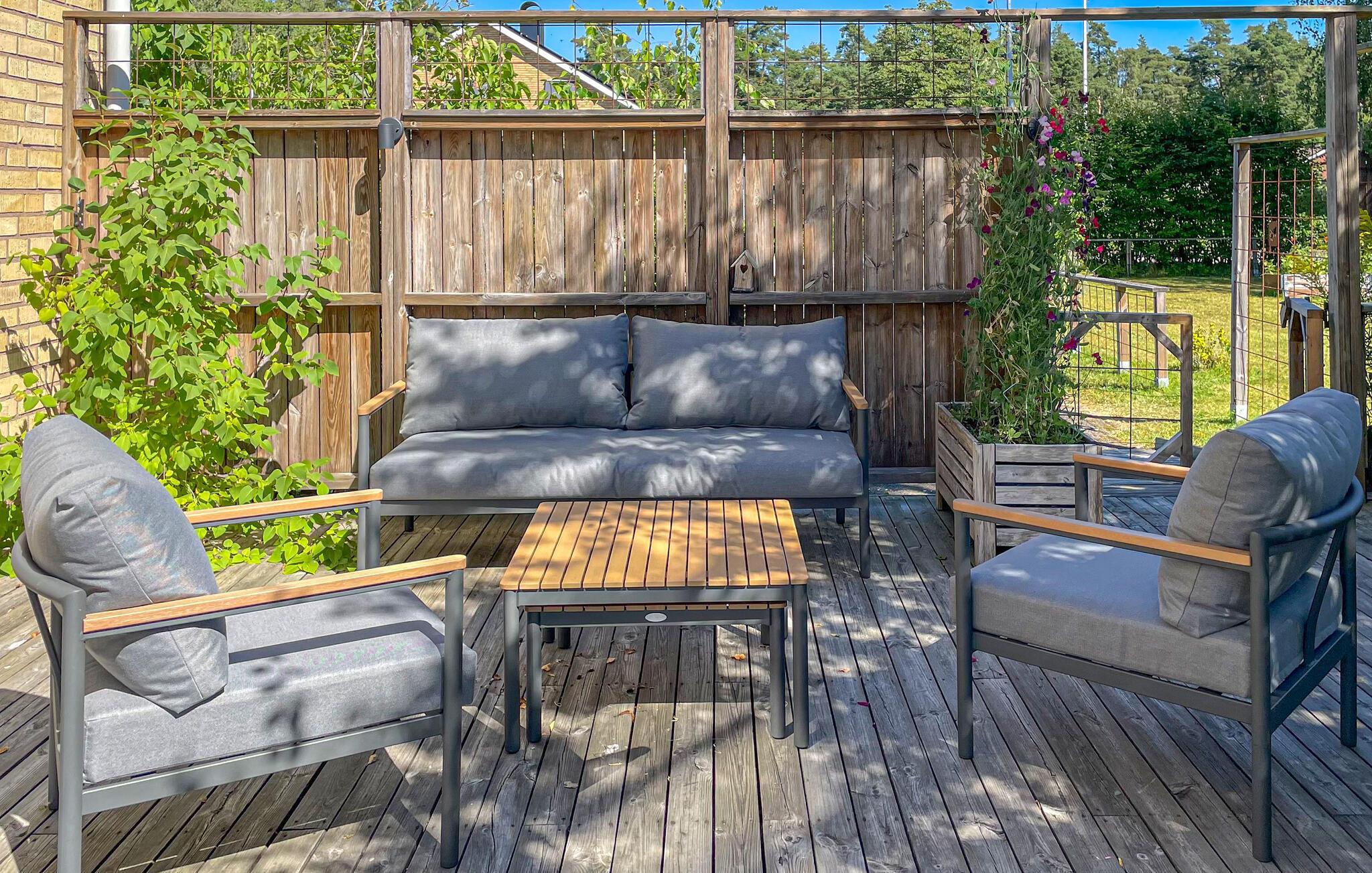 Lassen Sie die Kinder unbesorgt im großen, geschützten Garten spielen, während Sie auf der schönen Holzterrasse bei einem ausgedehnten Frühstück Ihre Unternehmungen planen. Plaudern Sie auf bequemen Sitzmöbeln und zelebrieren Sie die gemeinsame Zeit bei einem Grillfest unter freiem Himmel.