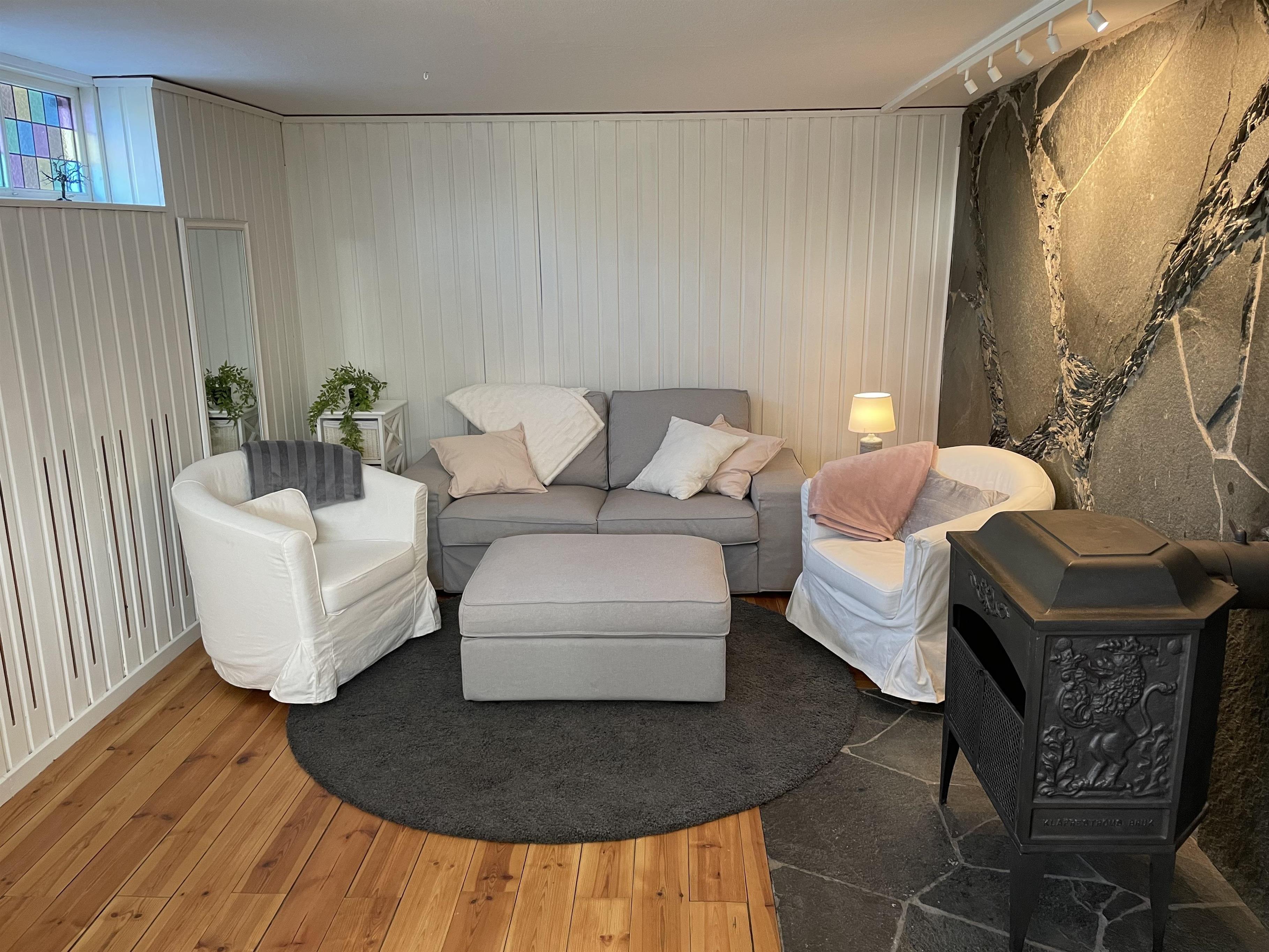 Im Untergeschoss/Keller befindet sich ein großes Schlafzimmer mit zwei Einzelbetten (zusammenstellbar), Sofaecke und Holzofen, Sauna und Bad/Waschküche. In allen Schlafzimmern kann eine zusätzliche Matratze platziert werden.