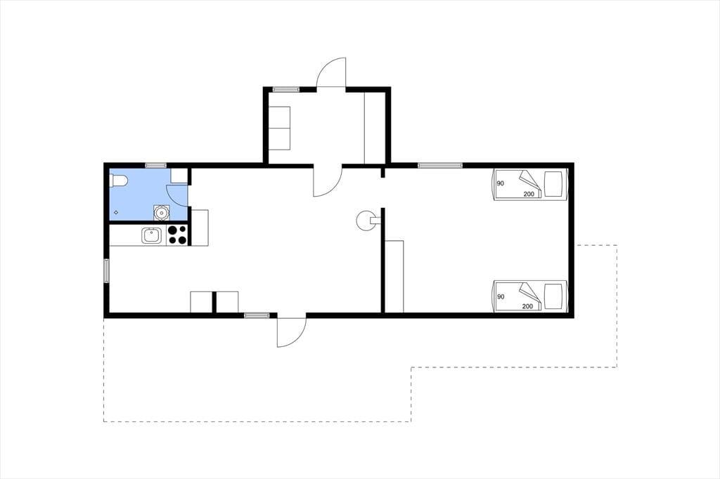 Das etwa 50 m² große, unmittelbar am Wasser liegende Ferienhaus bietet seinen Gästen ein kombiniertes Wohn-/Schlafzimmer, ausgestattet mit einem einzeln ausziehbaren Doppelbettsofa, in das seitlich eine Pantry mit Essecke integriert wurde. Die Pantry verfügt über Elektroherd mit Backofen, Mikrowelle, Kaffeemaschine, Spülmaschine, Wasserkocher sowie Kühl- und Gefrierschrank. Ein offener Durchgang führt von Wohnzimmer in das daneben liegende, große Schlafzimmer, ausgestattet mit zwei Einzelbetten und TV. Ein Gästebett kann dort bei Bedarf zugestellt werden. Darüber hinaus verfügt das Haus über ein Duschbad mit WC und Fußbodenheizung, in dem auch eine Waschmaschine und ein Trockner bereit stehen. Das Haus hat fließend kaltes und warmes Wasser und kann elektrisch beheizt werden. Von der nach Westen ausgerichteten Veranda auf der Seeseite hat man einen sehr schönen Ausblick auf den See und die bekannte Schlossruine Kronoberg und kann von dort aus sogar Angeln. Sommermöbel und Grill sowie ein Ruderboot, ausreichend Schwimmwesten und zwei Fahrräder sowie kostenfreies, schnelles W-Lan stehen den Gästen außerdem zur Verfügung.