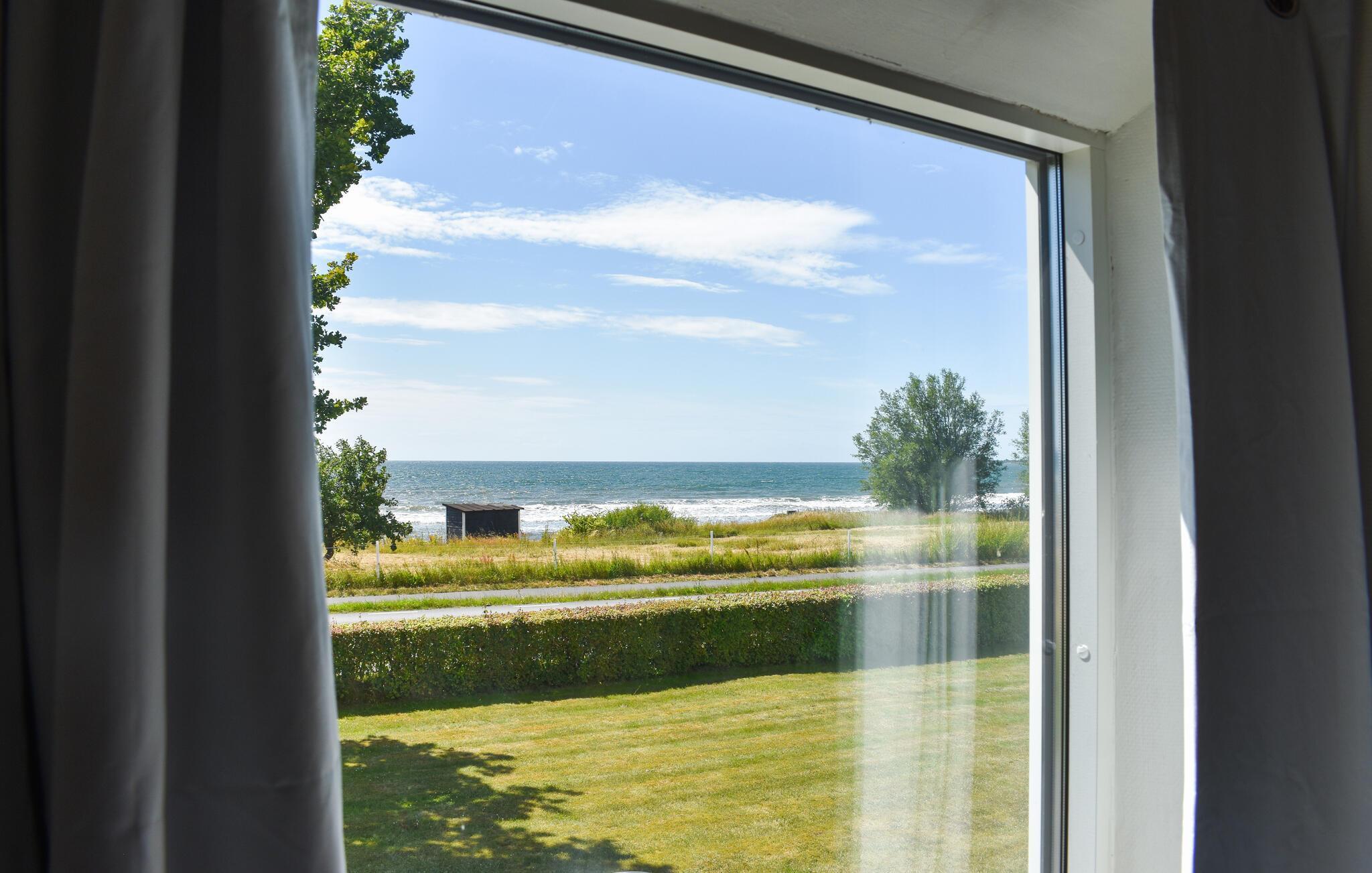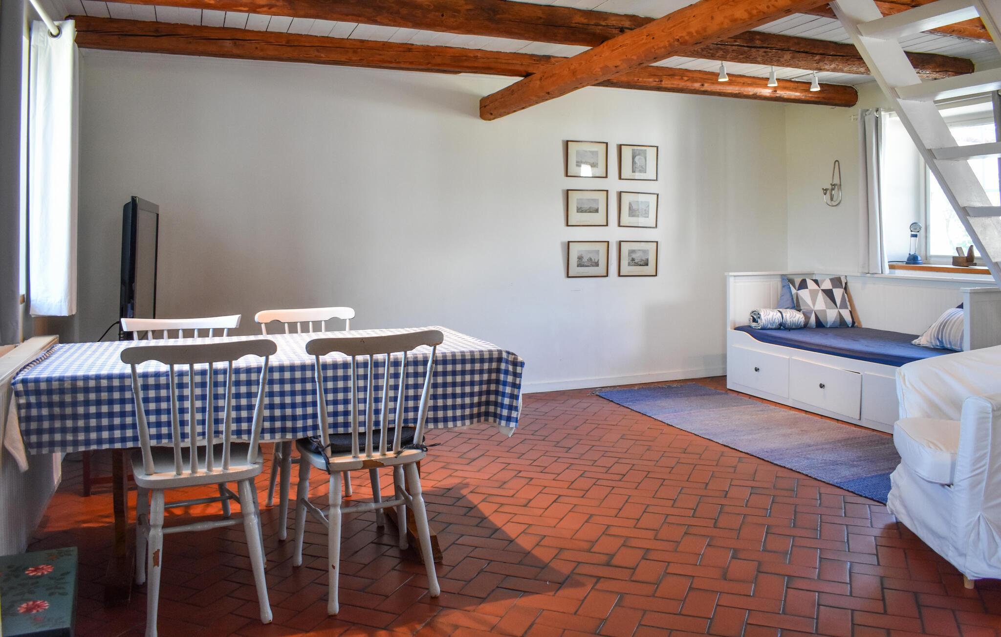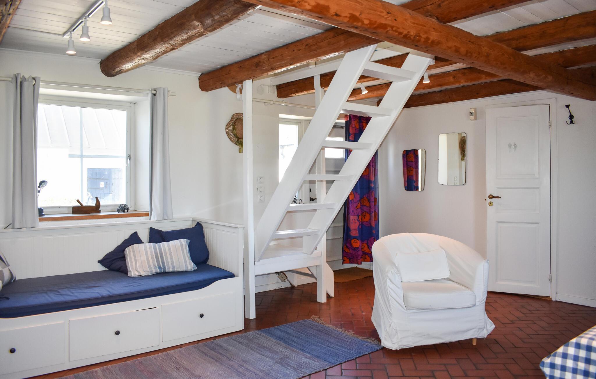 Ihr Ferienhaus liegt idyllisch nur wenige Schritte vom Meer entfernt, sodass Sie bereits beim Frühstück den Blick auf das Wasser genießen können. Die Einrichtung des Hauses besticht durch helle, freundliche Farben und gemütliche Möbel, die zum Verweilen einladen. Die sichtbaren Holzbalken und die maritime Dekoration schaffen eine einladende Atmosphäre, die sofort Urlaubsstimmung aufkommen lässt. Im Wohnbereich finden Sie eine gemütliche Sitzecke, und in der Küche können Sie Ihre Lieblingsgerichte zubereiten und diese in dem einladenden Essbereich servieren. Das Obergeschoss, mit Blick auf das Meer, bietet einen ruhigen Rückzugsort.