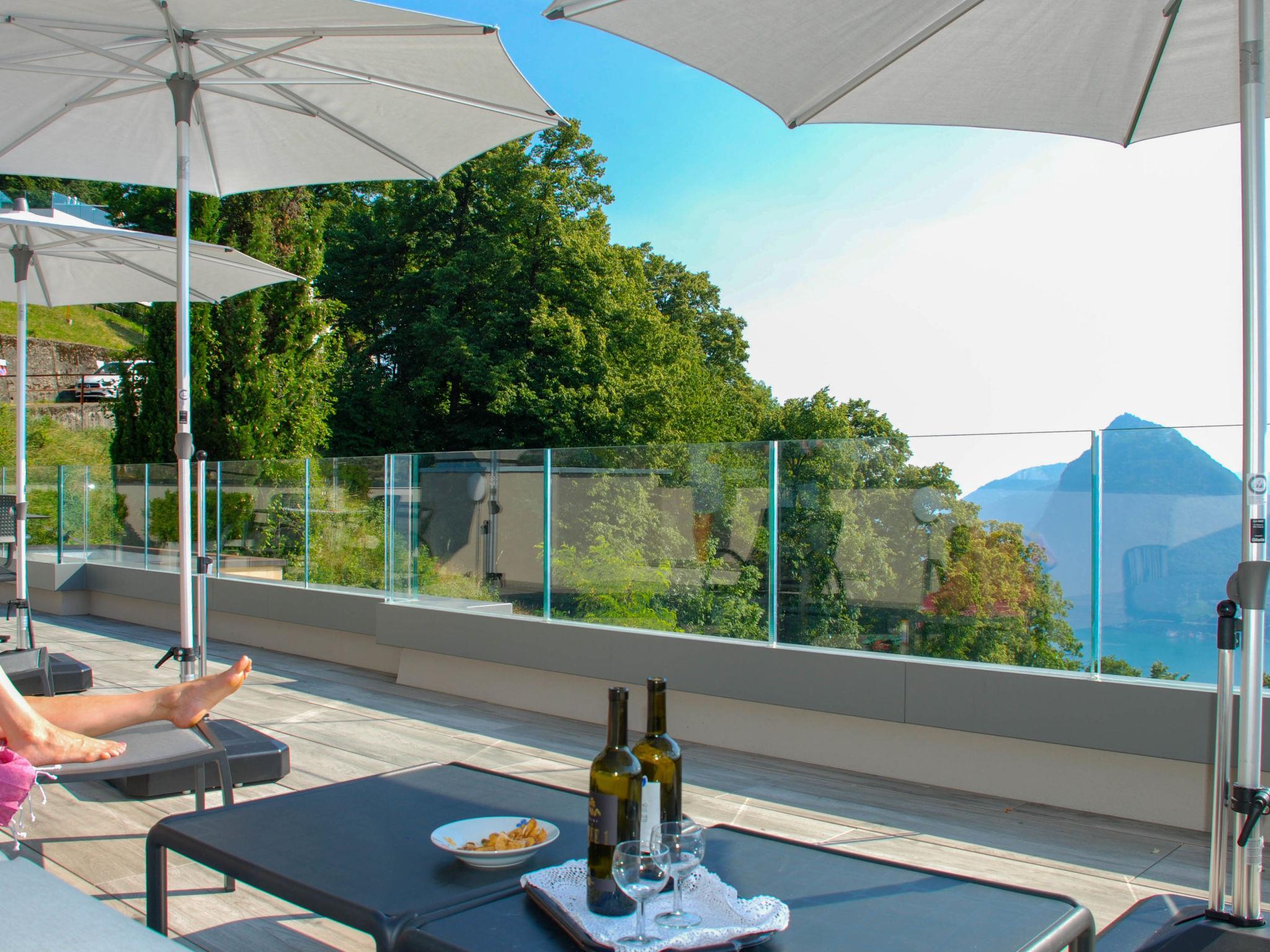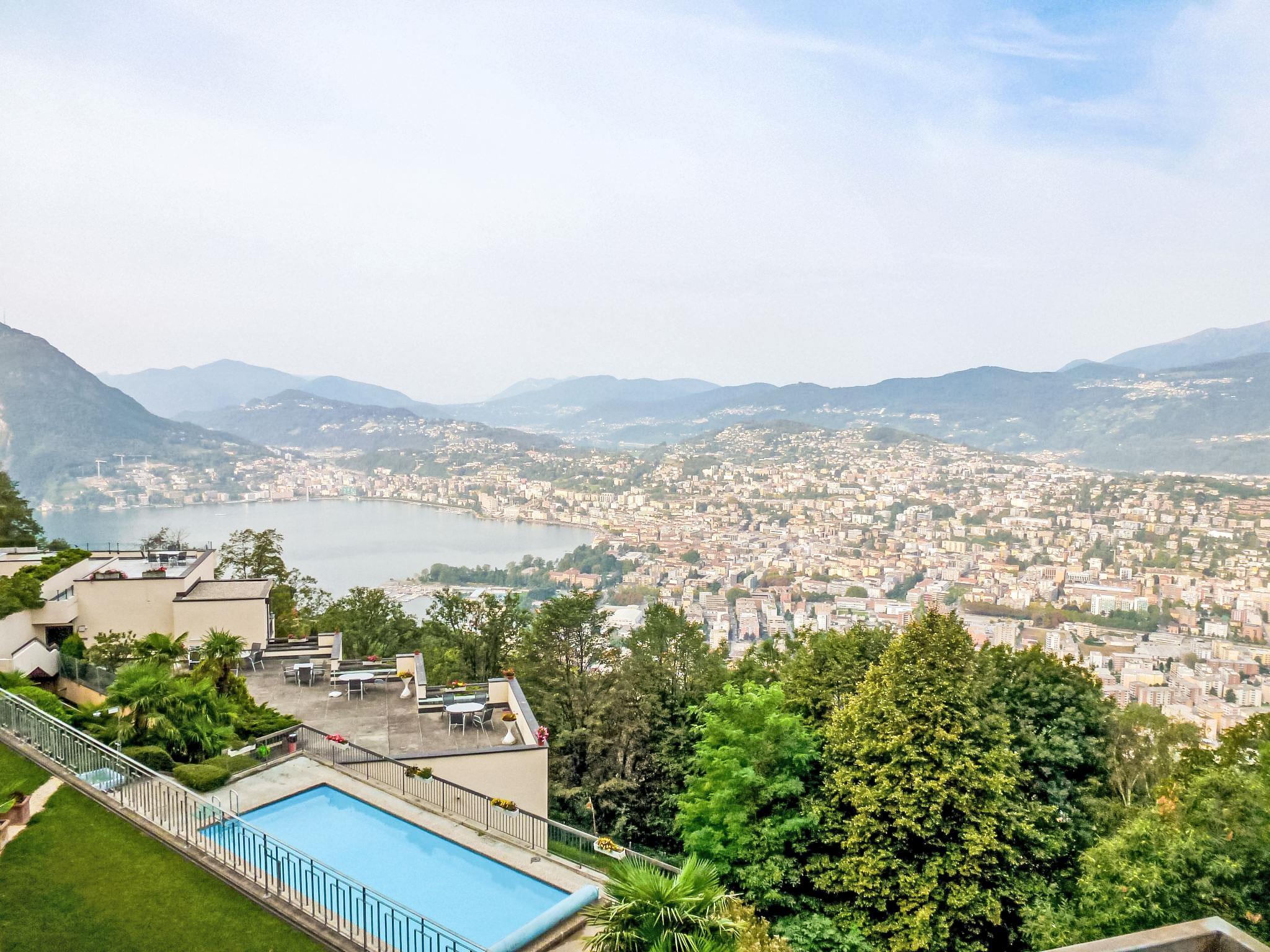 Aldesago 6 km from Lugano: Right in the middle of nature, on Mont Bré, is the comfortable apartment block "Residenza Monte Bré Aldesago". 34 apartments in the residence. Above Lugano, in a quiet, sunny position on a slope, 5 m from the edge of the forest, 4.4 km from the lake, in a cul-de-sac, in the countryside. For shared use: swimming pool angular heated (12 x 4 m, depth 154 - 160 cm, seasonal availability: 19.Apr. - 25.Oct.) with internal staircase. Outdoor shower, table tennis, terrace. In the house: central heating system, washing machine (for shared use). Motor access to the house (mountain road). Parking (extra) at the house. Grocery 6 km, shopping centre 12 km, bus stop "Bus Nr. 12" 200 m, railway station "Lugano SBB/FFS" 7.2 km, lake Lago di Lugano. Golf course (18 hole) 15 km, walking paths from the house 1 m. Nearby attractions: Gandria 5 km, Swiss Miniatur, Melide 13 km, Museum Hermann Hesse, Montagnola 11 km, Mercato Ponte Tresa, IT 17 km, Como 40 km. Well-known lakes can easily be reached: Lago di Lugano, Lago di Como, Lago Maggiore. Hiking paths: Monte Tamaro, San Salvatore-Carona-Parco san Grato, Alpe Vicania-Morcote. Please note: car recommended. Suitable for seniors. Additional accommodations can be booked. Property ref. CH6974.102 is situated on the same property. Partial view of Lugano. "Utoring-Aldesago" cable car at 50m. Elevator only in Building II. Covered parking outside: CHF 10.00/day. Uncovered parking: CHF 7.00/day., reservation upon arrival. WLAN around the reception. Public transport (bus and cable car) to Lugno every 30min.