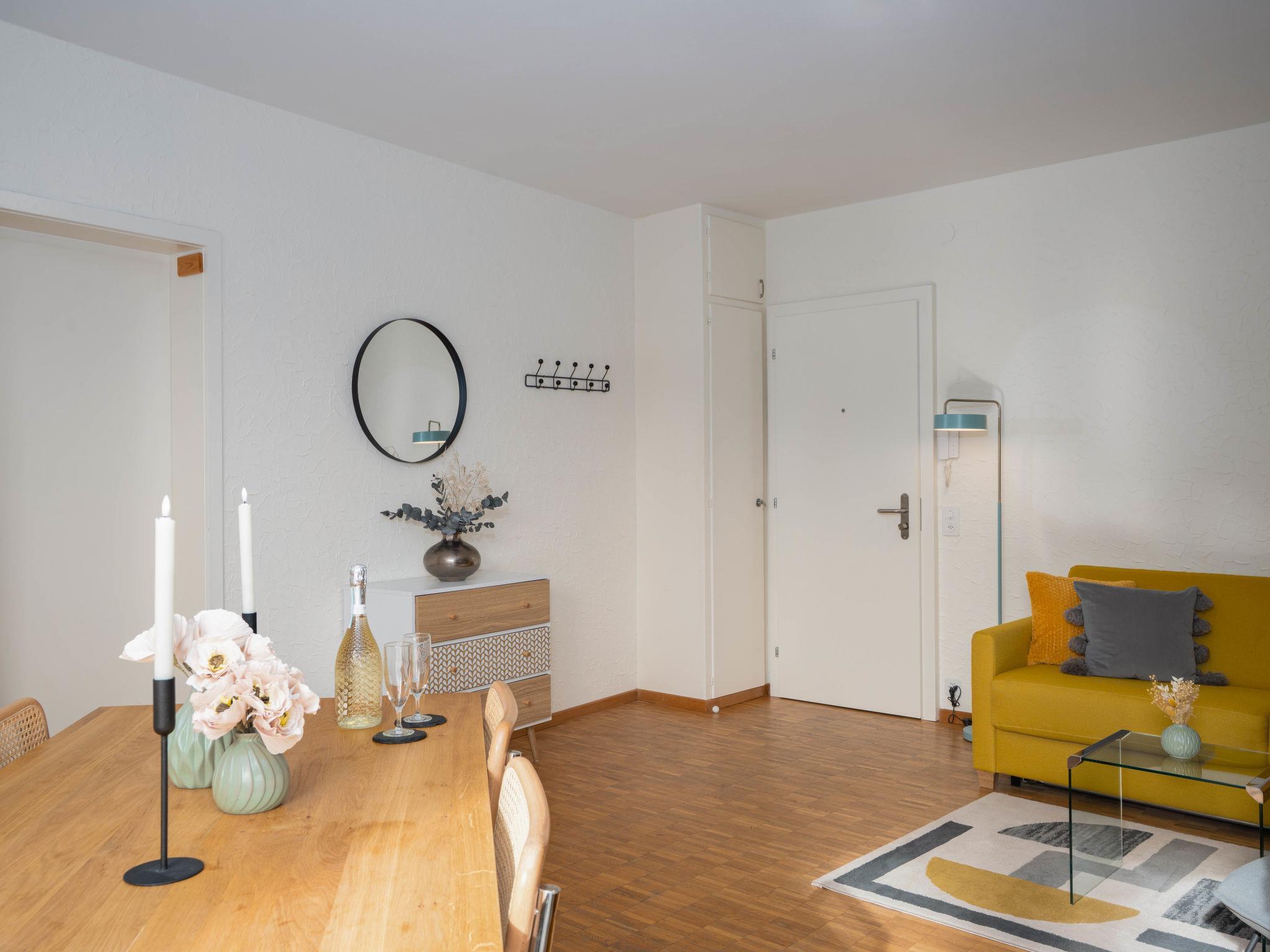 "Suite Modern", 2-room apartment 60 m2 on 1st floor, west facing position. Renovated: living/dining room with 1 double sofabed (1 x 160 cm, length 200 cm), TV and radio. 1 room with 1 double bed (1 x 180 cm, length 200 cm). Open kitchen (oven, electric coffee machine, Capsules for coffee machine (Nespresso) extra). Bath/WC. Oil heating. 2 balconies, west facing position. Partial view of the lake, the mountains and the resort. Facilities: Internet (WiFi, free). Please note: non-smoking house. Maximum 1 pet/ dog allowed. NL-00004951