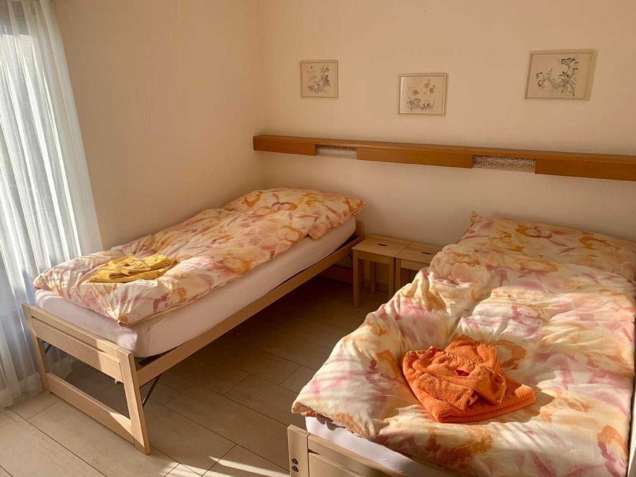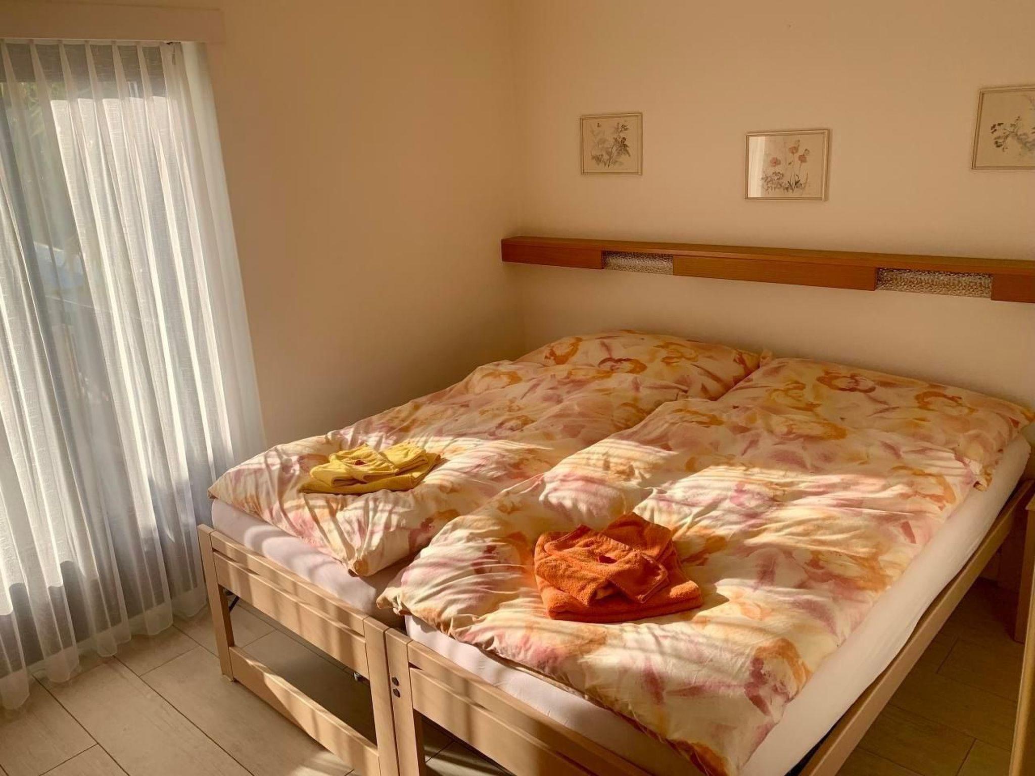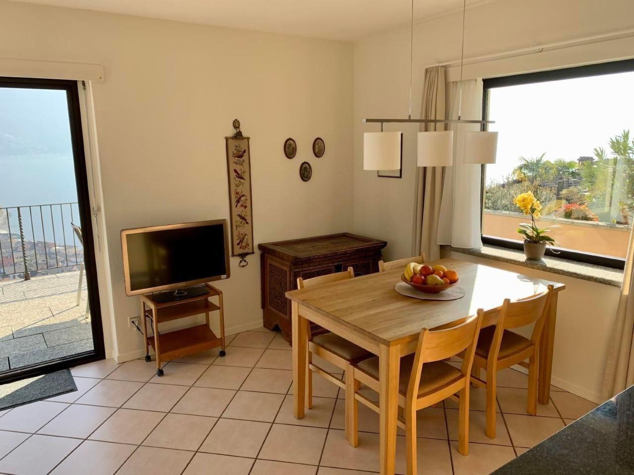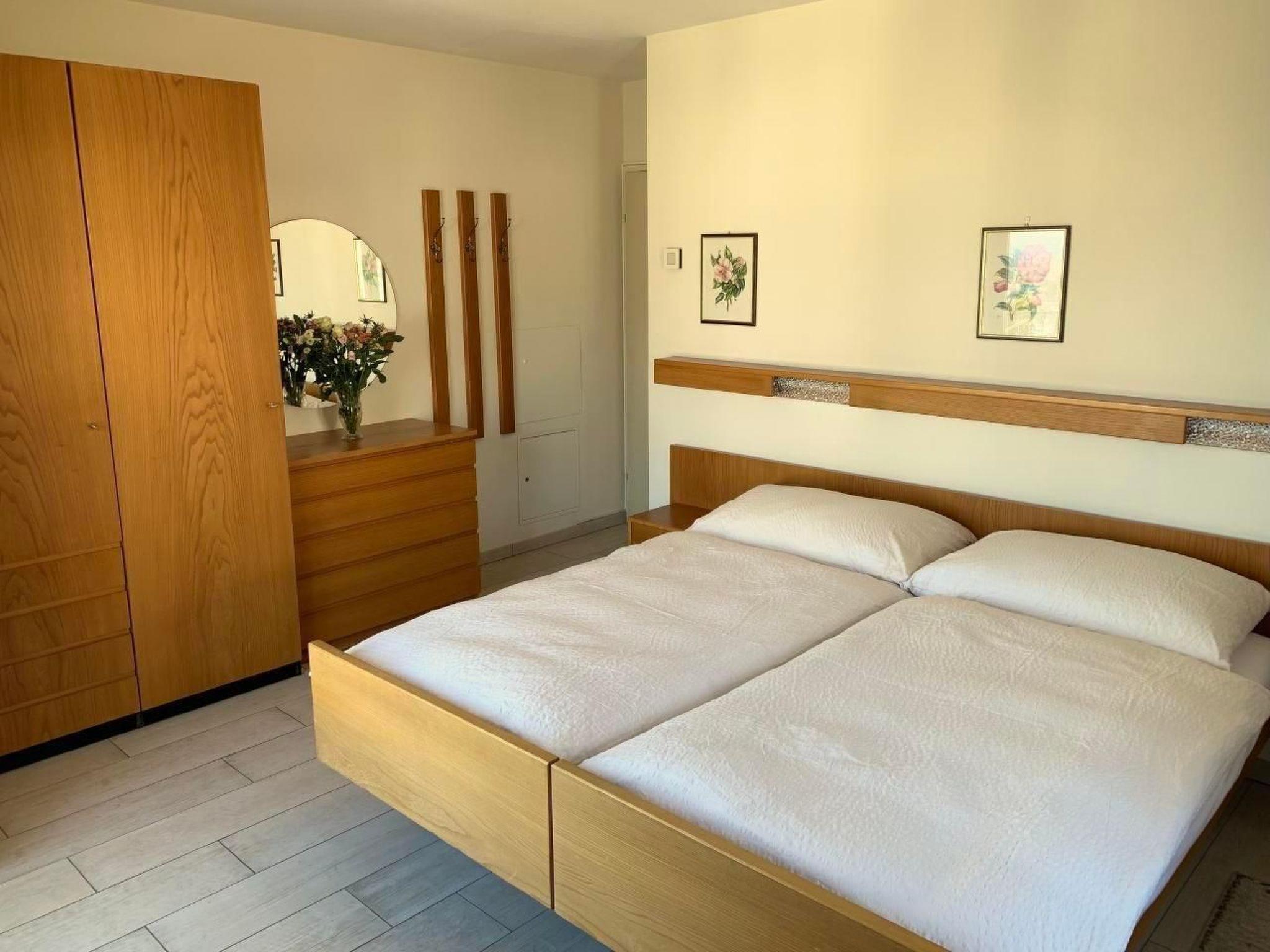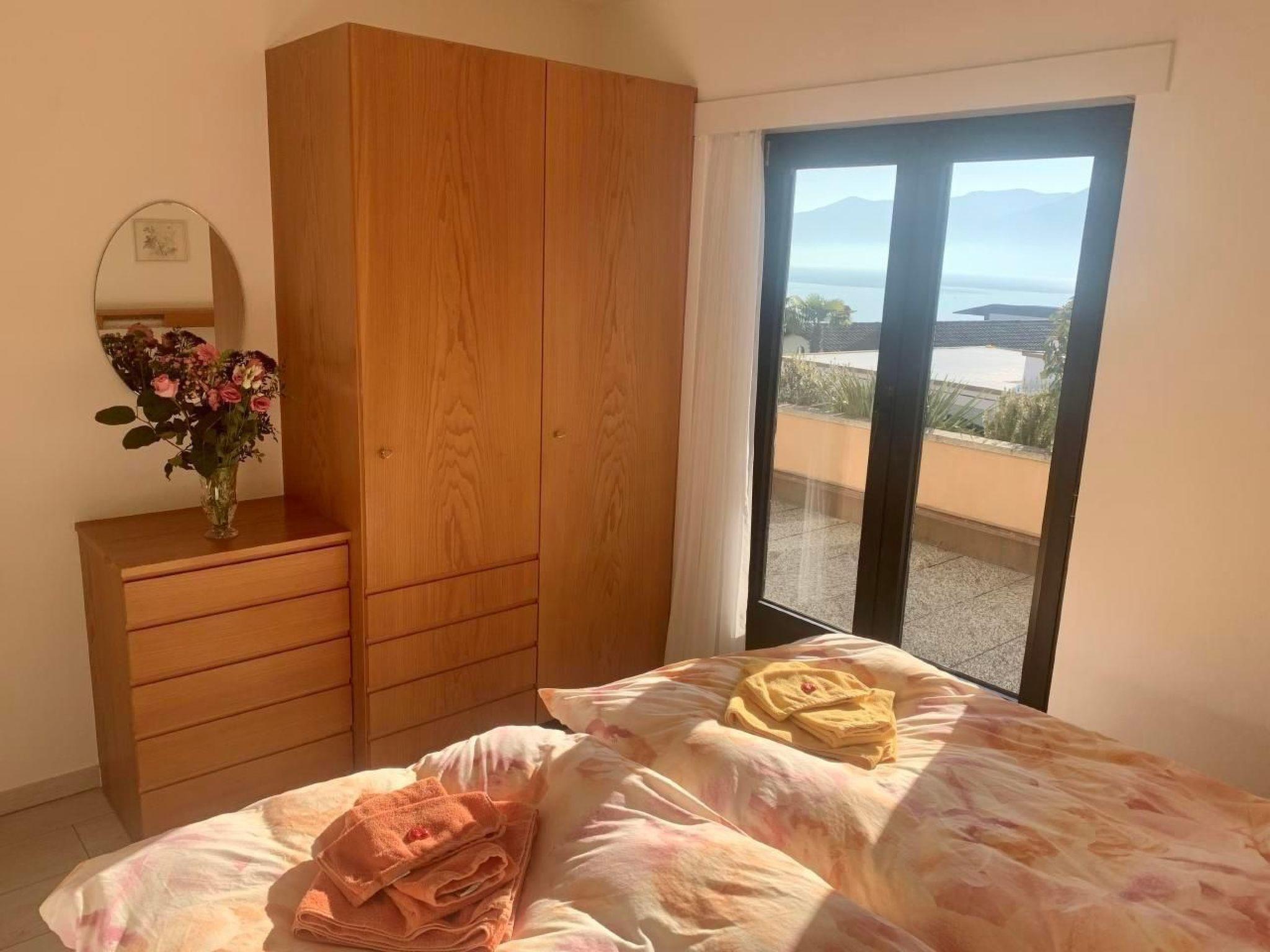 Attic flat: Bright, cosy three-room flat with large sun terrace (90 m2) and fantastic views over Ascona, the lake and the surrounding mountain ranges. The terrace, which surrounds three sides of the flat, has a barbecue, table and deckchairs. Direct terrace access from all rooms. Living room with panoramic window, dining table and sofa bed. Two double bedrooms. Bathroom with washbasin and shower, separate WC with washbasin.