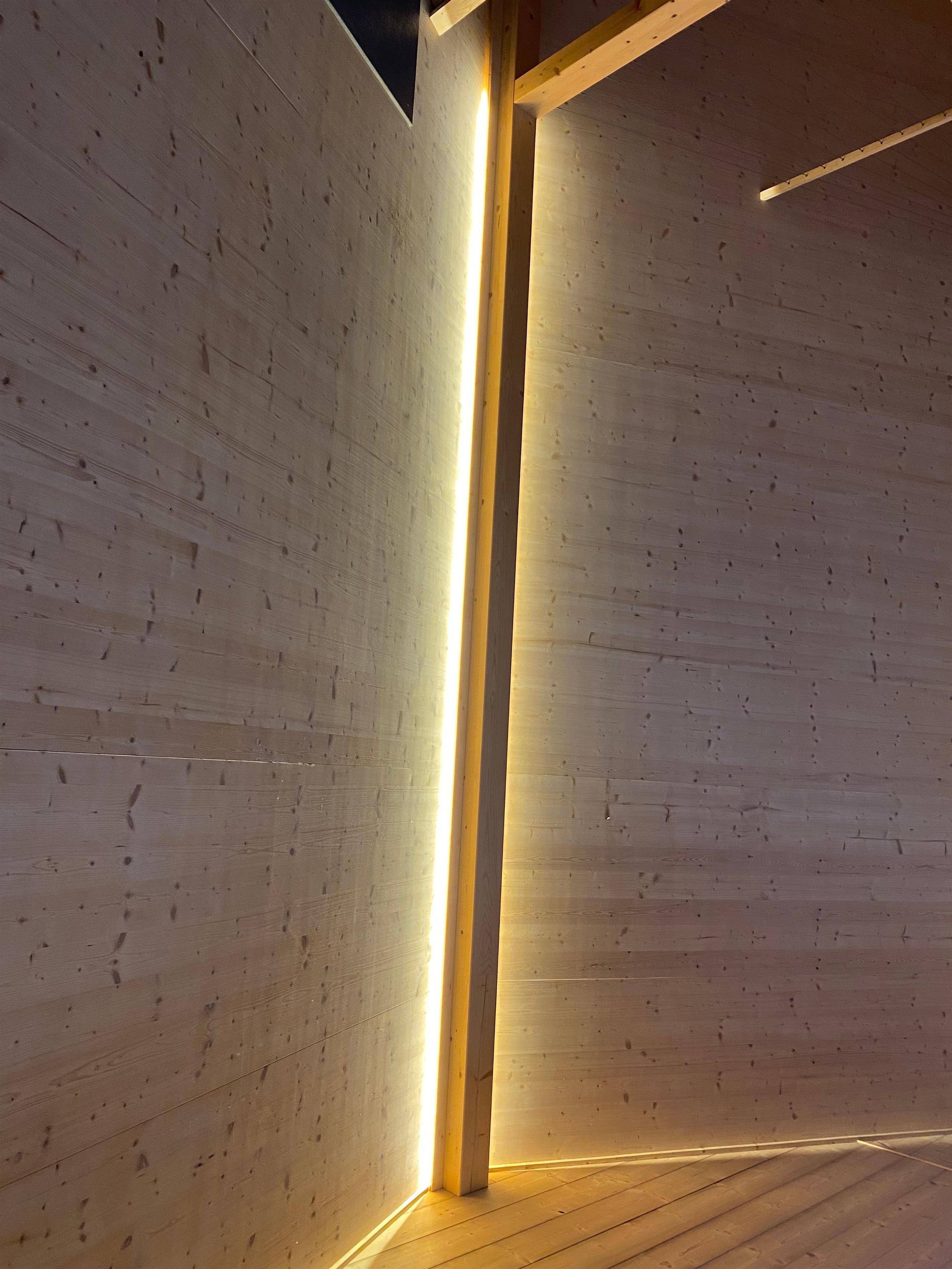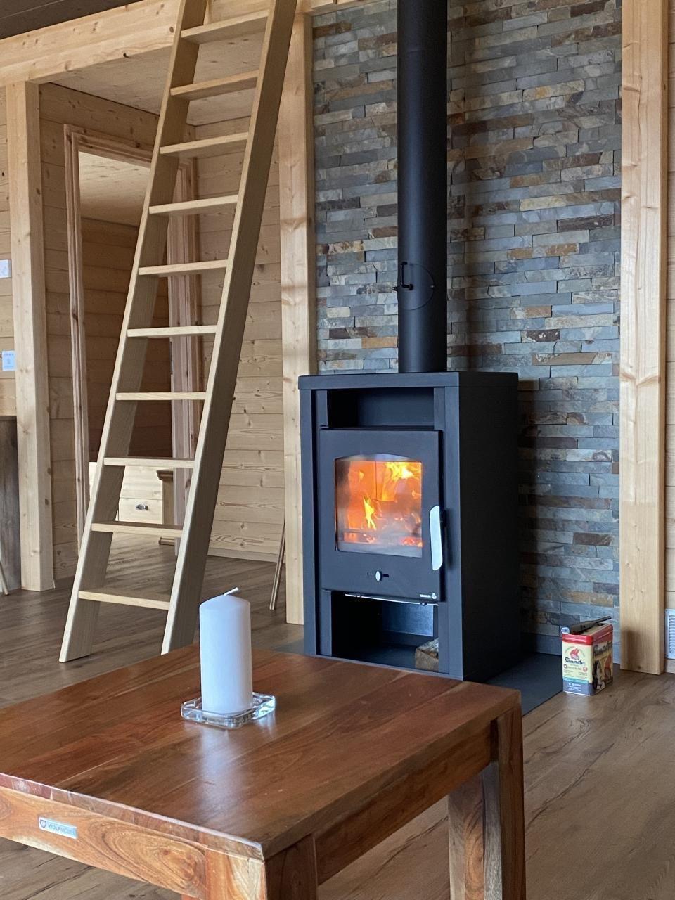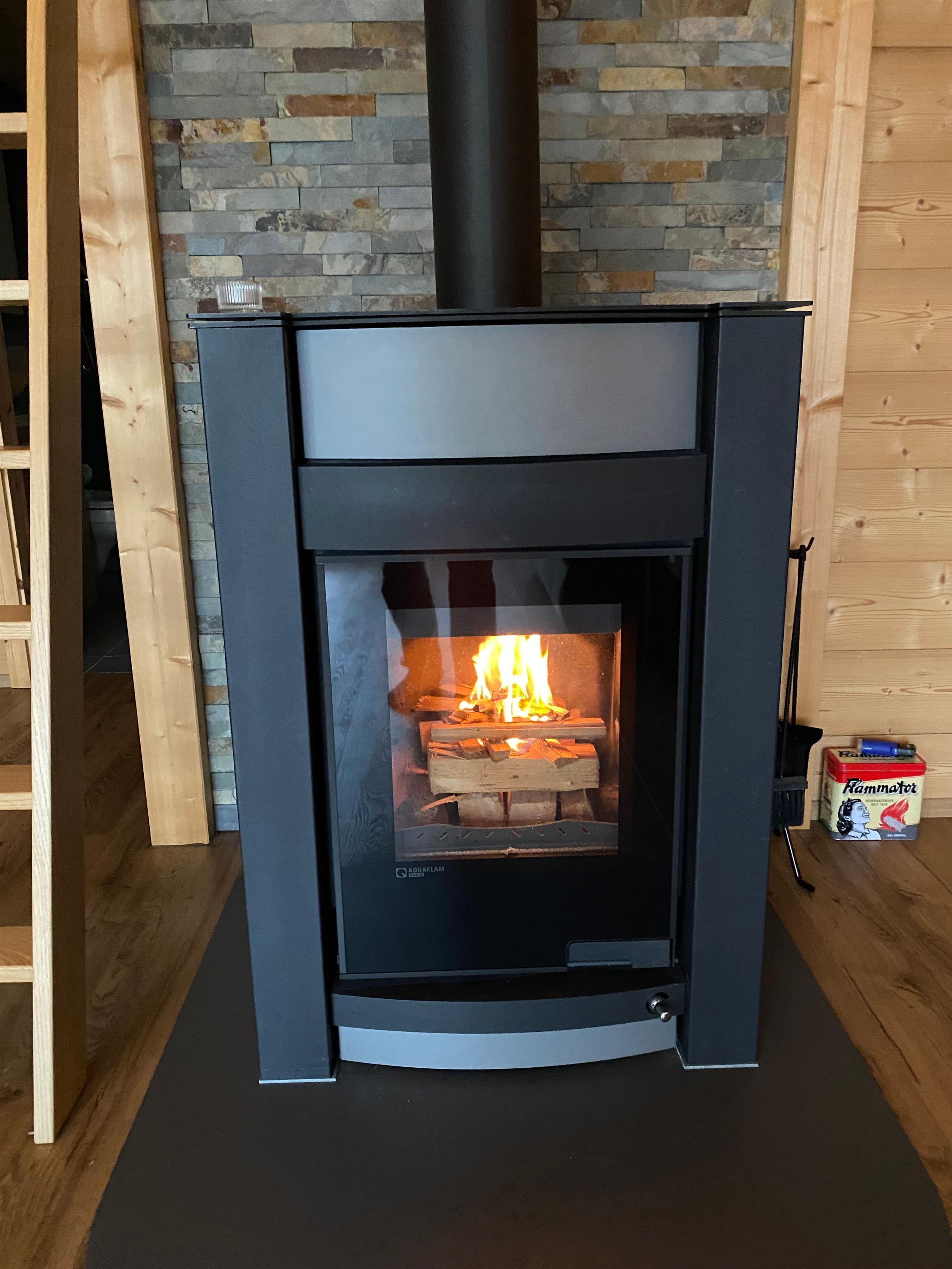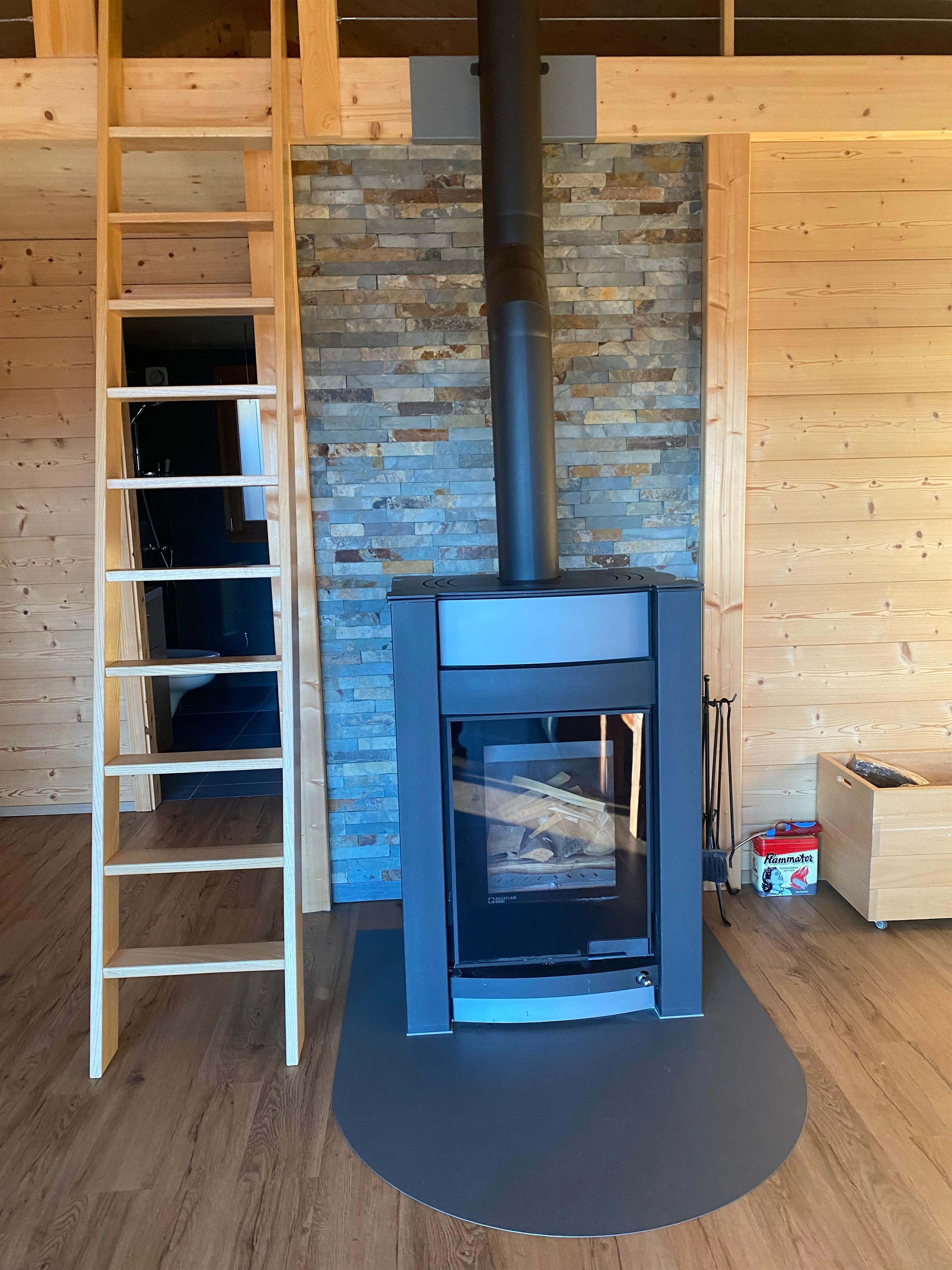 The fireplace, together with the solar system, also feeds the underfloor heating.