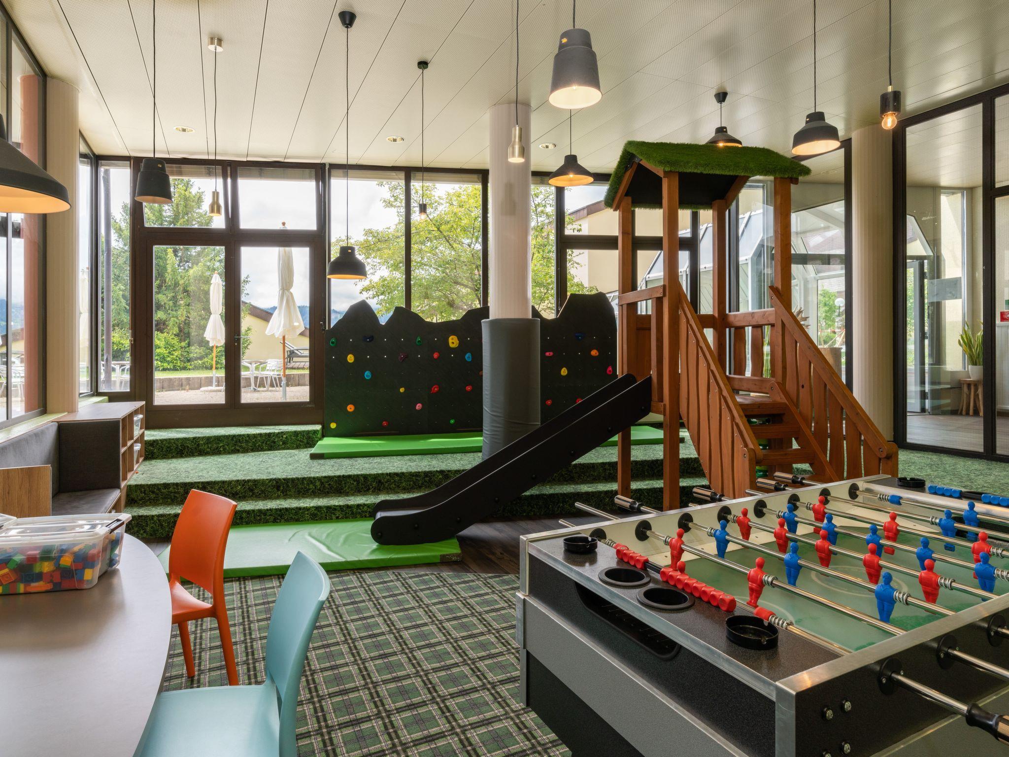 Reception, restaurant, bar, breakfast room, lounge, indoor pool, wellness area (bio sauna, steam bath, Finnish sauna, relaxation room, experience shower, infrared cabin, massage (extra), fitness room, table tennis, billiard table, playroom, elevator, storage room for bicycles, sun terrace, storage room for skis, central heating system, washing machine/dryer (for shared use, extra). Breakfast possible (extra), room service possible (extra). Reserved parking space in underground parking lot. Charging stations for electric vehicles.