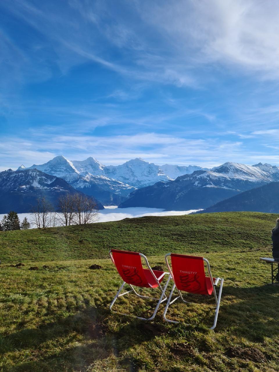 The outdoor area boasts a magnificent balcony from which you can enjoy the majestic view of the Eiger, Mönch, Jungfrau and Lake Thun. It's the perfect place to take in the breathtaking natural scenery with a glass of wine or a hot cup of tea. This outdoor area seamlessly extends your living space into the beauty of the Swiss mountains.