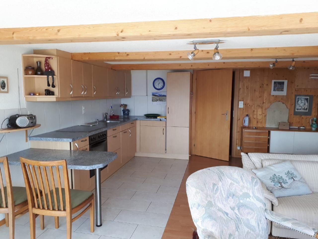 Inside you will find a cosy eat-in kitchen with sofa, lounge table and armchair as well as a bedroom with a double bed. A cot is available if required. The flat is equipped with a television and a seating area. Additional comfort is provided by the bathroom, which has a shower with a bench for people with walking difficulties. A fully equipped kitchen with crockery, drinking glasses, cutlery and pans is also at your disposal.