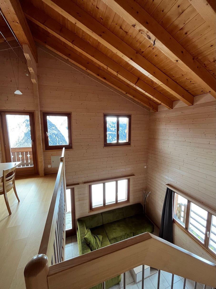 This charming, bright holiday home, situated on the edge of the forest on the upper edge of the village of Bellwald, can accommodate up to 8 people. With three cosily furnished bedrooms, two fully equipped bathrooms and generously high ceilings, this house offers enough space and comfort for all guests and is also ideal as a home office.