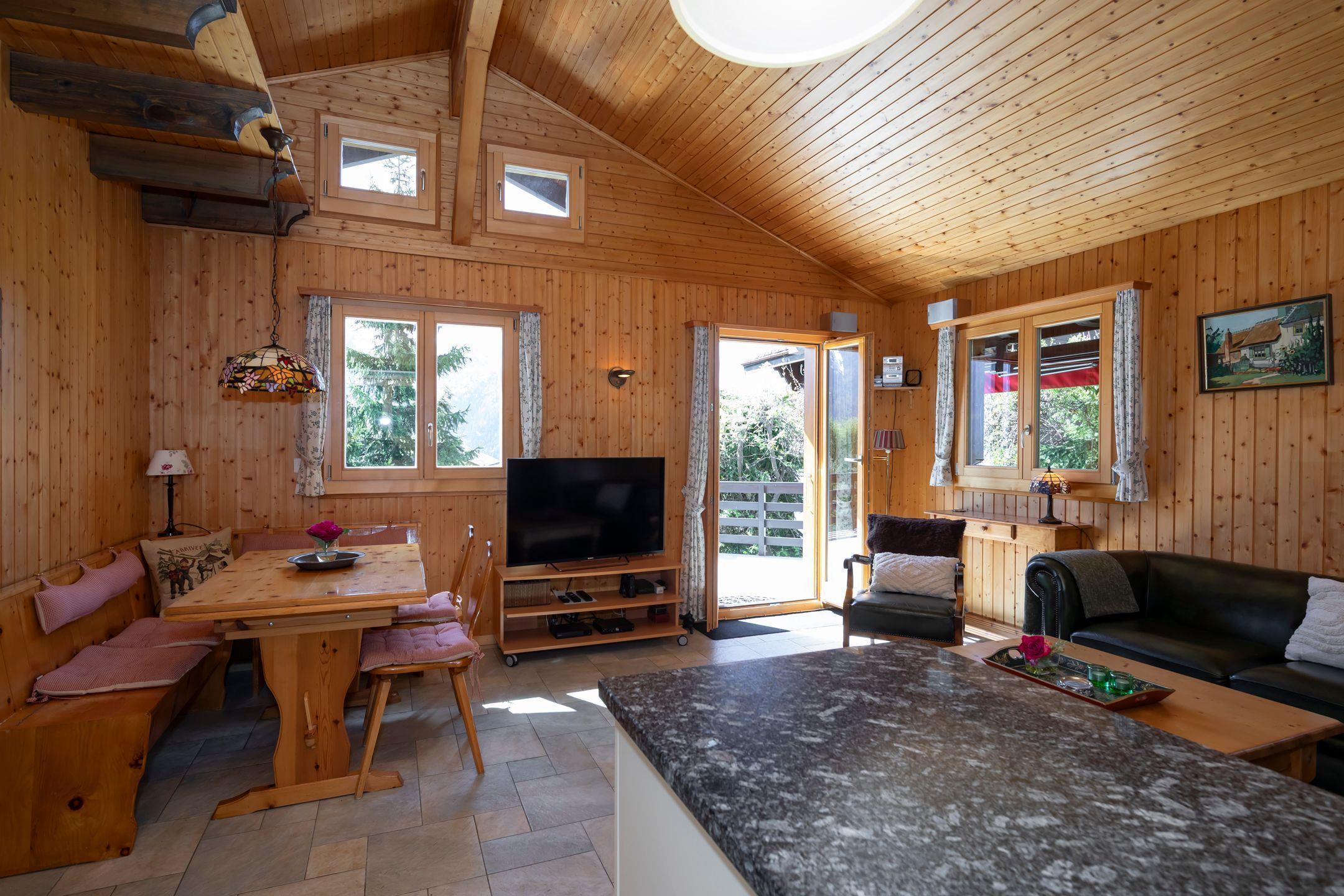 And because being together is the most important part of a great holiday, you can laugh and linger together while preparing meals in the open-plan living and dining area. The additional cosy atmosphere in the chalet is provided by the large windows and the beautiful fireplace on cool evenings.
