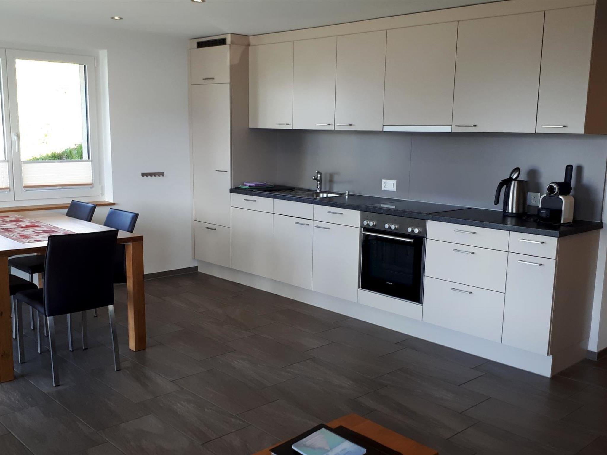 The 3 1/2 room apartment on the ground floor accommodates up to five people. The main bedroom is equipped with a double bed, while the second bedroom has two single beds and a practical pull-out bed. The open living kitchen is bright and includes a dining table, a dishwasher and other kitchen appliances for daily needs. Next to the kitchen is the living area with a sofa and a television. The bathroom is equipped with a shower, a sink and a toilet. A special highlight is the south-facing garden seating area, which is furnished with garden furniture and offers both sunshine and a view of the surrounding mountain landscape.