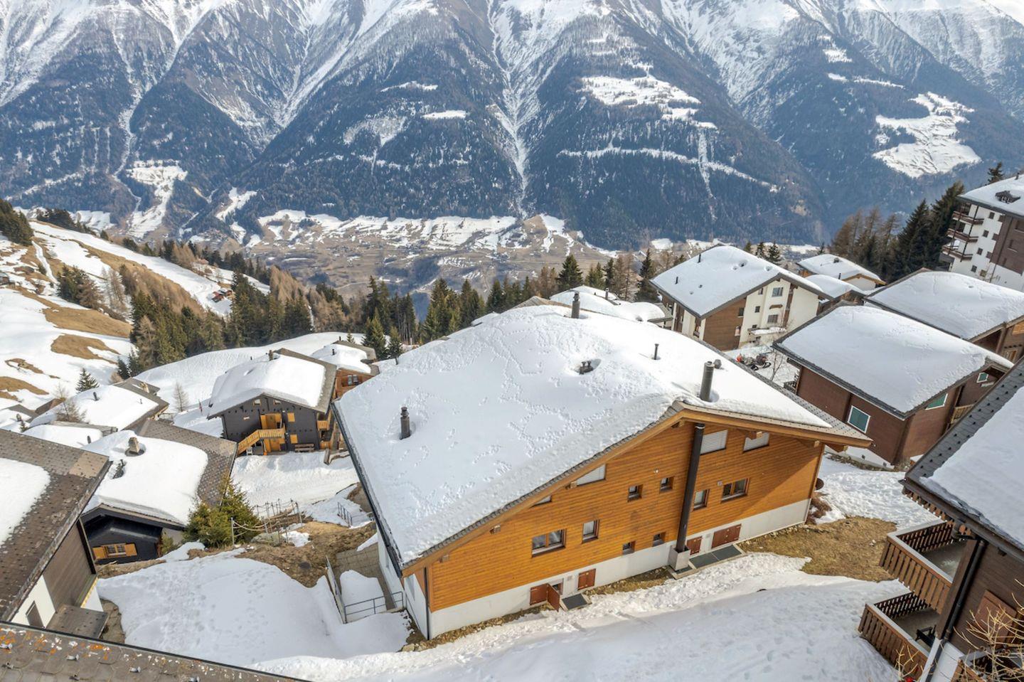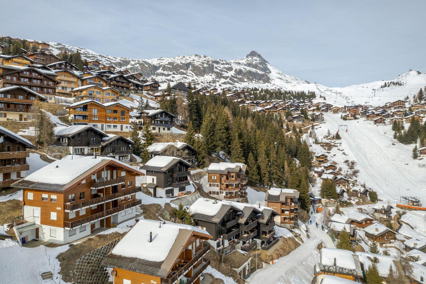 Ruhig und zentral in den Alpmatten, ab Seilbahnstation ca 450 m, rund 15 Min zu Fuss. Unweit des Fussgänger-Verbindungsliftes ins Dorfzentrum und der talwärts führenden Strasse, welche im Winter zur Piste, hin zum nahe gelegenen Skilift und Winterwanderweg nach Betten wird. Im Sommer direkt am Wandergebiet.