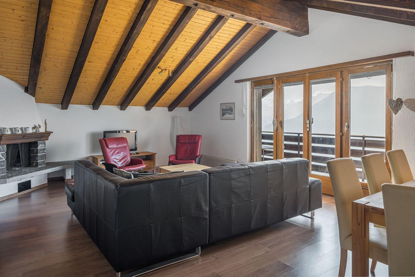 Entree/Garderobe, gut ausgestattete modernen Küche mit Geschirrspüler + Mikrowelle, ein Badezimmer mit Bad, Bidet und Doppellavabo, ein Tages-WC mit Lavabo, 2 Doppelschlafzimmer, davon ist ein Schlafzimmer etwas durch die Dachschräge in der Höhe beschränkt. Grosser Wohn/Essraum mit gemütlicher Eckbank, Polstergruppe. Flat Screen, DVD, Radio. Das Cheminée verschönert, speziell bei kühleren Aussentemperaturen, gemütliche Abende durch die vom Feuer erzeugten Wärme. Im Wohnzimmer befindet sich ein komfortables modernes Schrankbett für 2 Jugendliche, das unproblematisch ausgeklappt werden kann. Der gemütliche Balkon mit Blick auf die Walliser Alpen lädt dazu ein, den hektischen Alltag zu vergessen.