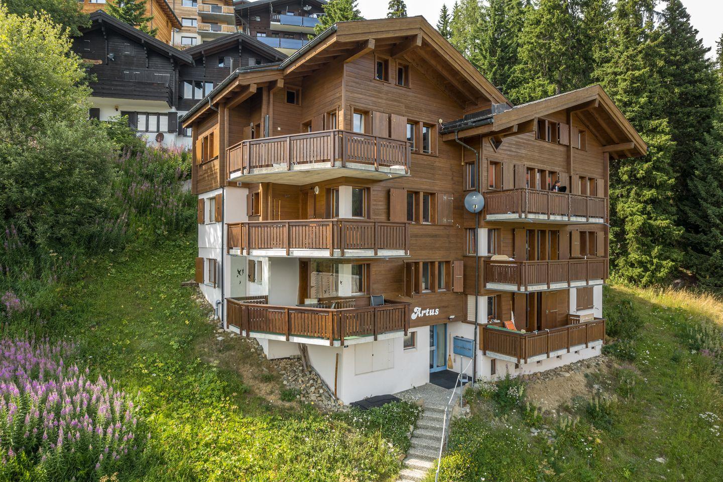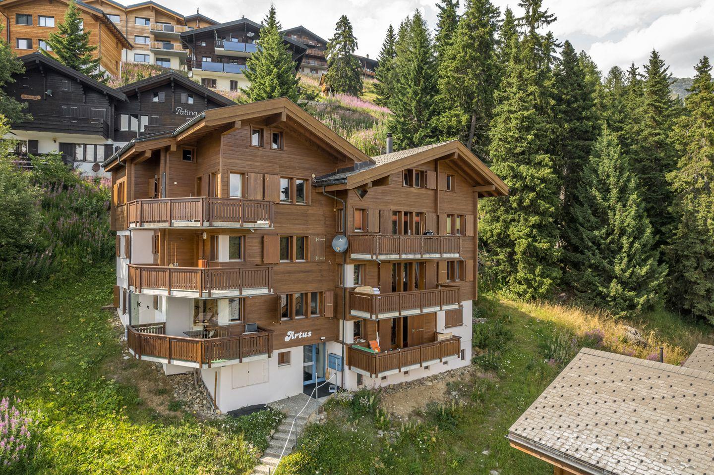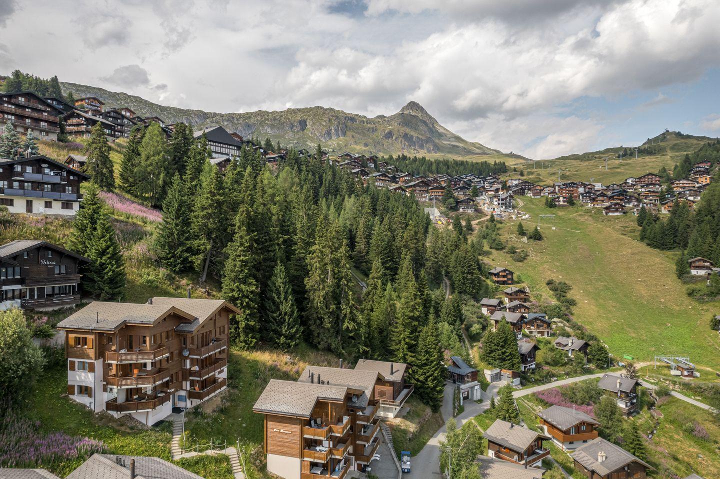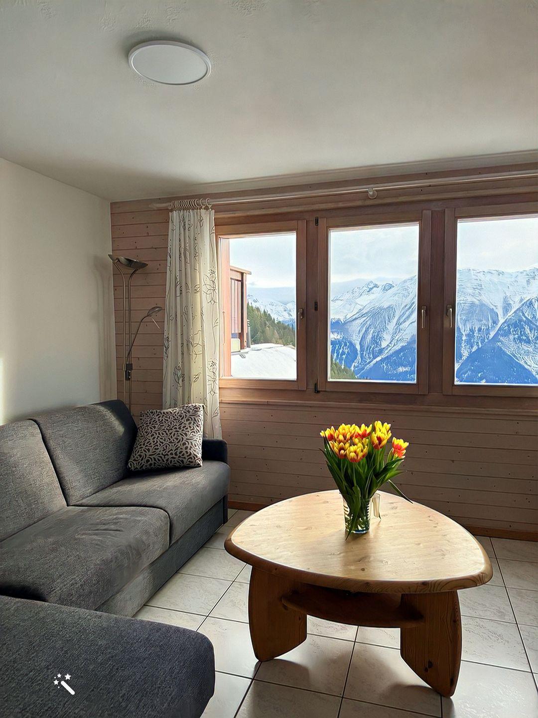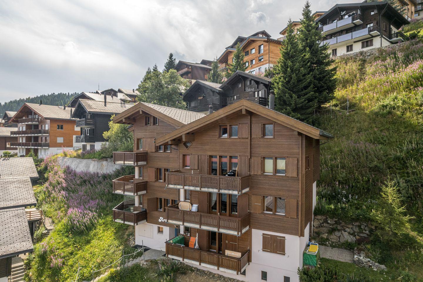 Genießen Sie die spektakuläre Aussicht auf die majestätischen Walliser Viertausender, während Sie sich in unserer gemütlichen 2,5-Zimmer-Wohnung im ersten Obergeschoss entspannen. Das Chalet ist nach Süden ausgerichtet und bietet Ihnen einen herrlichen Blick auf die umliegenden Berge.