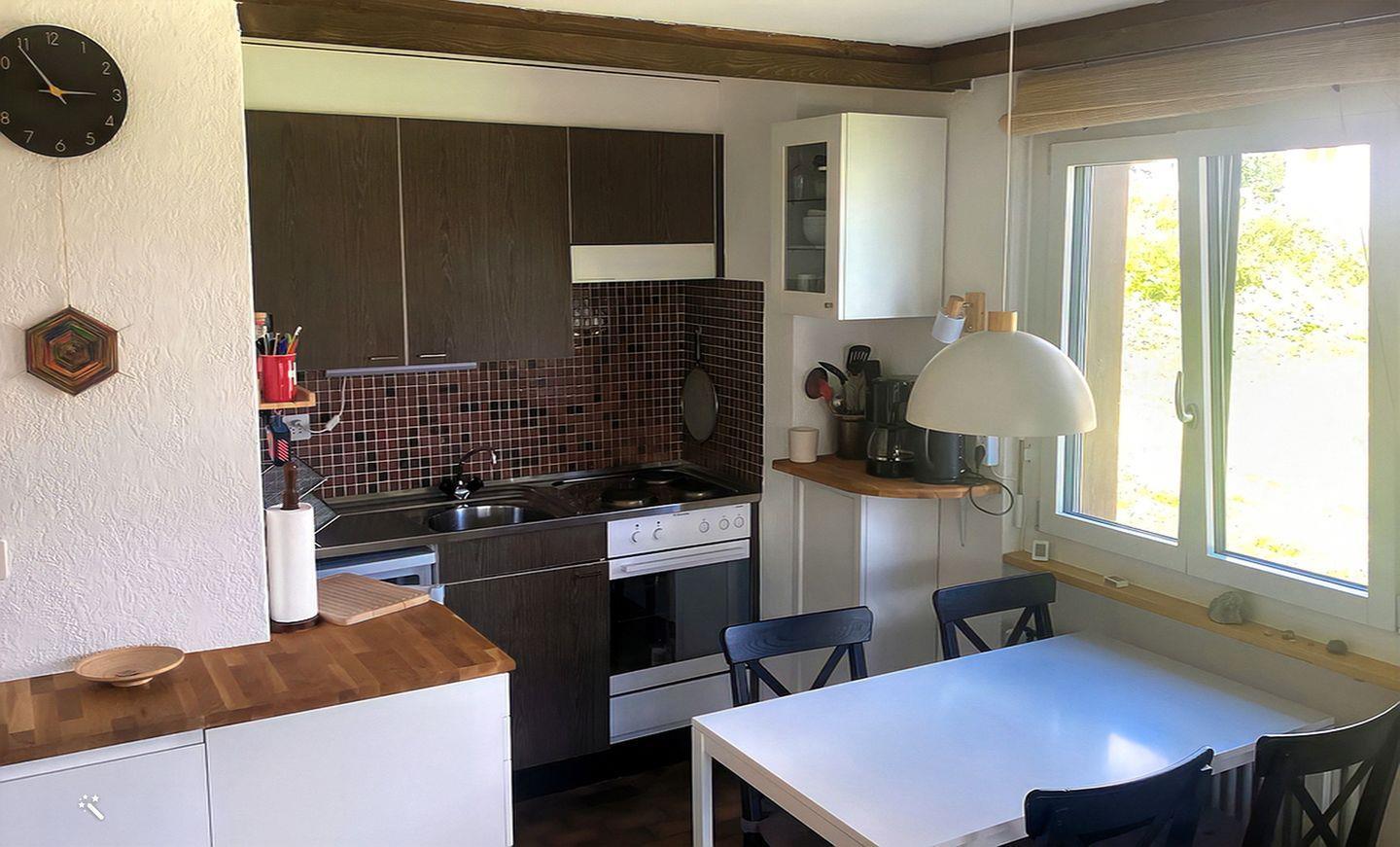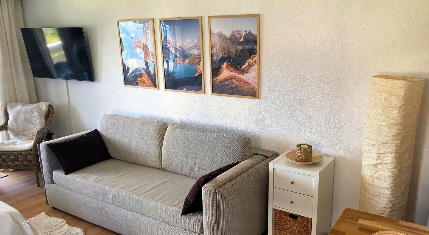 Wohnraum: Das gemütliche Studio bietet Platz für 2–3 Erwachsene. Der Wohnraum wurde 2025 grundlegend renoviert. Der offene Wohn- und Essbereich präsentiert sich hell und modern; die großzügige Fensterfront schenkt das ganze Jahr über einen fantastischen Blick auf die Berge. Der Wohnraum verfügt über ein großes Doppelbett mit viel Stauraum durch umliegende Schränke und ein Sofa mit Schlafmöglichkeit. Es ist ausgestattet mit einer hochwertigen Kaltschaummatratze in 80 × 190 cm. Ein großer Fernseher und WLAN ergänzen die moderne Ausstattung, ebenso wie Spiele und ein Fondue für gemütliche Winterabende. Der Balkon lädt jederzeit dazu ein, das Bergpanorama und die Natur zu genießen.