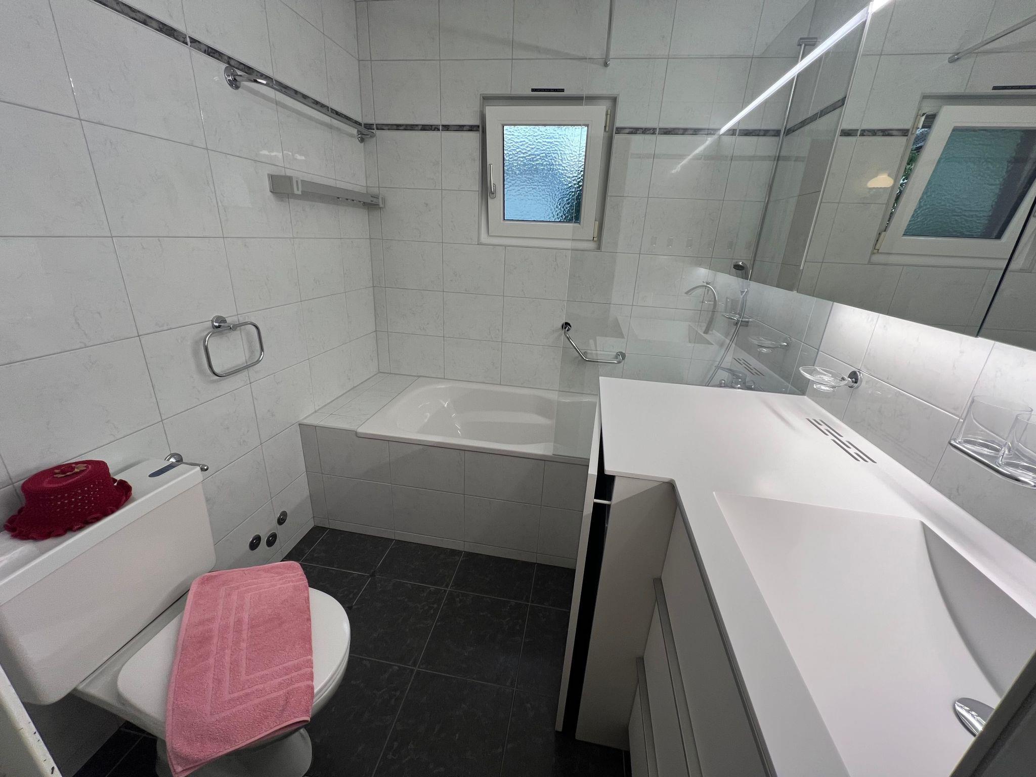 The flat impresses with its well thought-out interior, which leaves nothing to be desired. A spacious living/dining room with access to the balcony, two bedrooms with double beds, one bedroom with two single beds and two bathrooms, one with a shower and one with a bathtub, offer plenty of space and comfort. Entertainment is provided by an HD TV and free Wi-Fi access. A fully equipped kitchen with ceramic hob, Nespresso coffee machine and fondue set makes self-catering easy. A washing machine and tumble dryer are available for your exclusive use.